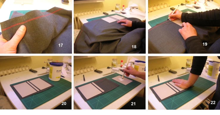 Wichtig ist der Stoff, der den Buchdeckel umschließt. Darauf kam es mir besonders an, deshalb habe ich lange gesucht. Und in unserem lokalen Fachhandel gab es diesen einen, tollen Wollstoff in Feldgrau mit einem roten Streifen! (17) Ich habe den gleich mitgenommen. Der Wollstoff ist etwas dicker, saugt sehr stark und ist im feinen Detail schwierig zu verarbeiten, weil er relativ grob gewebt ist. Zuerst habe ich die geplanten Deckel aufgelegt, den Umriss in der korrekten Größe eingezeichnet (18 und 19) und dann ausgeschnitten. Nun wurde es schwierig, denn der Stoff war nicht einfach zu kleben! Nahm ich genug Leim, kam er durch und verursachte Flecken auf der Außenseite. Nahm ich wenig, löste er sich wieder. Ich bin fast wahnsinnig geworden! Schließlich war es dann doch ganz einfach - aber man muss erstmal drauf kommen: Leim auftragen, kurz antrocknen lassen und DANN erst auf den Stoff. Der Leim wird beim Trocknen erst richtig klebrig und zäh, zieht also nicht tief ein, pappt aber bombenfest. Puh! Mit viel Druck habe ich so die Pappe auf den Stoff bekommen (22). Knifflig war es, den überstehenden Rand umzuschlagen und festzuleimen; der störrische Stoff klappte stets zurück. Hat aber funktioniert! Daraufhin hab ich mir ein Glas Wein gegönnt, wie man sieht.