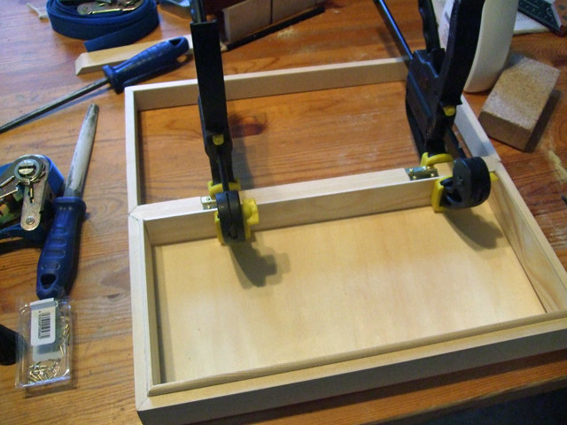 Also, eine trotz allem billige Gehrungssäge auf ebay ersteigert und damit konnte ich wenigstens halbwegs passende Leisten sägen. Nachdem ich die Leisten endlich zusammengeleimt hatte ( Wichtig: Messen, nachmessen, anzeichenen und