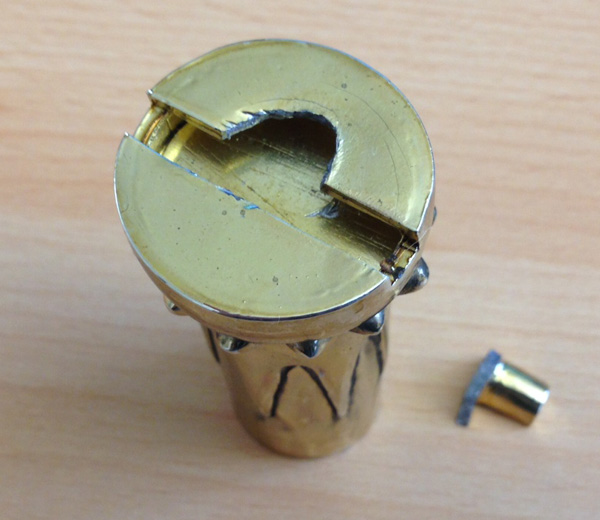 Ebenso brauche ich eine Idee, wie ich die Basis am Stab befestige. Das Teil hat ein Loch von 12mm Durchmesser und 5mm Wandstärke (daher extrem schwer). 18mm/2mm wäre deutlich sinnvoller, dann könnte man den Stab direkt reinstecken. So denke ich bohr ich ein 12mm Loch in meinen Stab und leime einen 12mm Dübel rein.