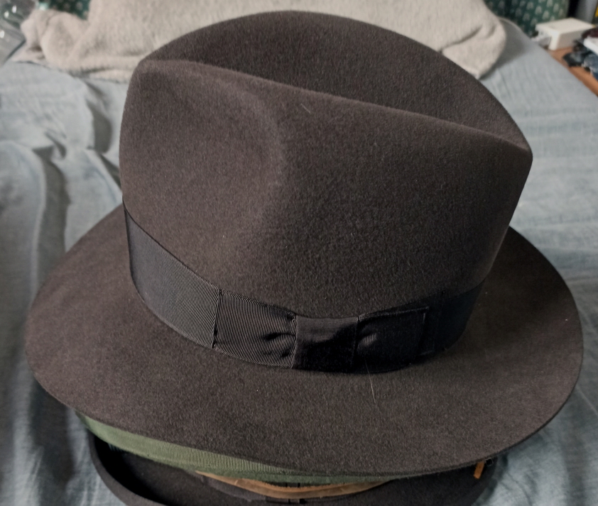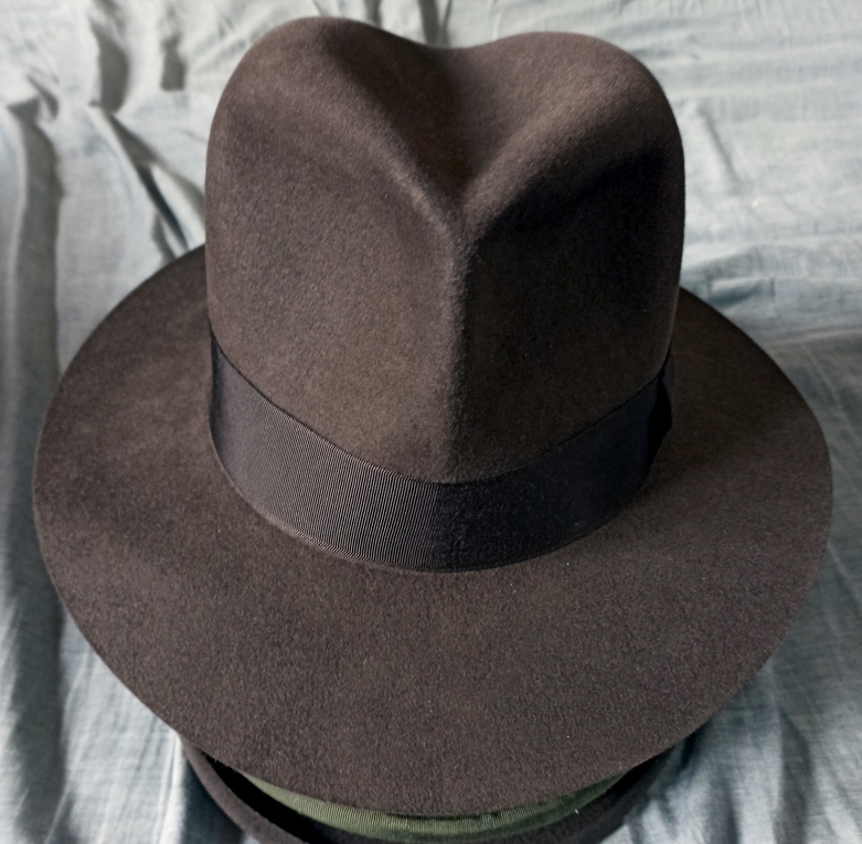 Der braune Hut ist nun mein dritter "Indiana Jones Hut" mit der bisher seitlich geradesten Krone und der besten Steifheit und Formbarkeit.