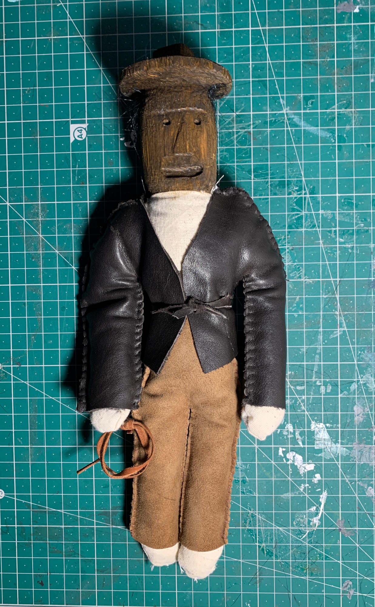 Der Holzkopf ist aus Hemlock. Mit groben Feilen die Grundform gefeilt und dann mit Dremel und Schnitzmessern weiterbearbeitet. Anschließend unsauber gebeizt