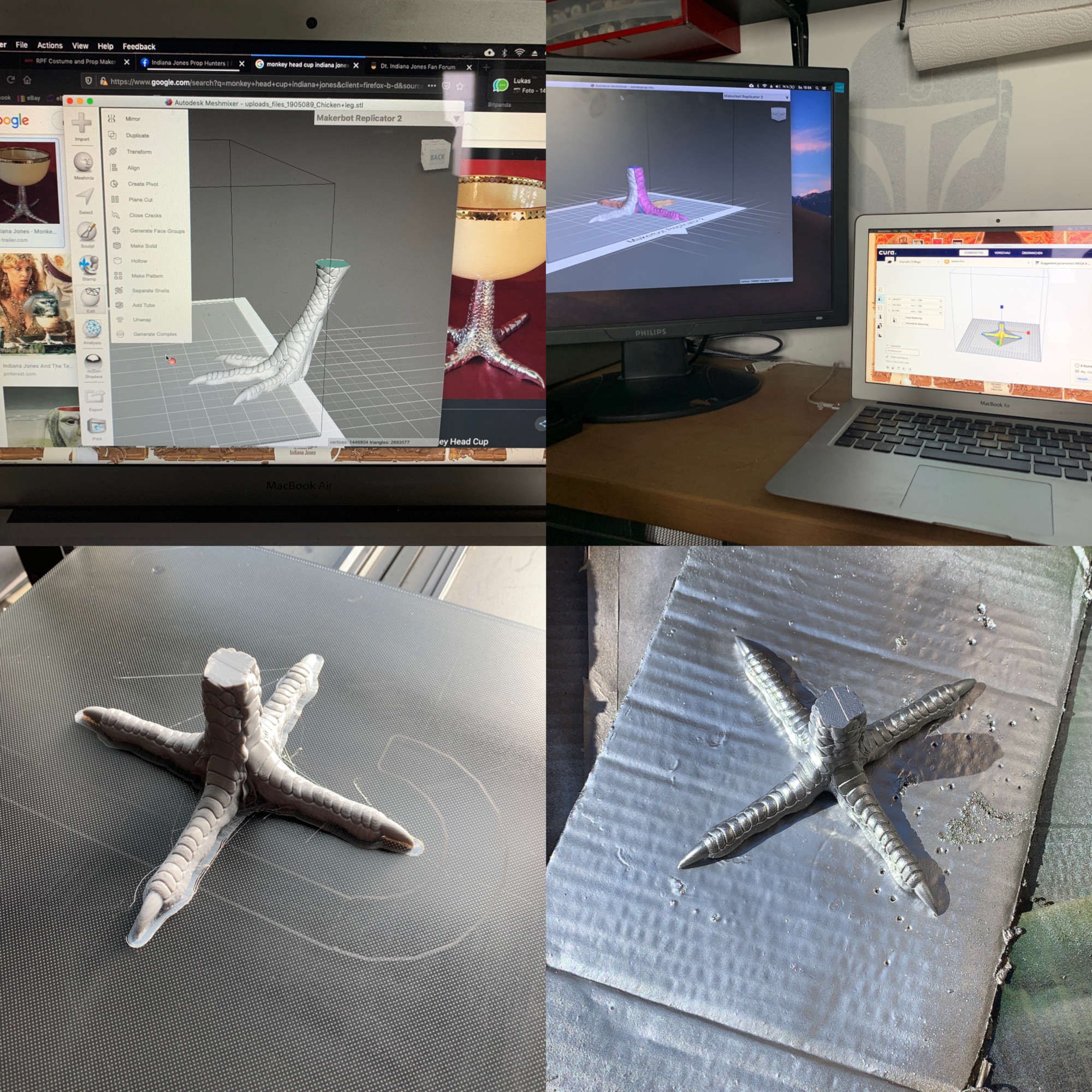 Standfuß habe mir ein 3D Modell eines Hühnerfußes besorgt und dieses so bearbeitet dass die typisch Form mit 4 Zehen enstand. Anschließend habe ich mehrere Versionen gedruckt. Glatt, klein, groß, etc. Hängen geblieben bin ich doch bei der ersten Version, dem Hühnerfuß mit der typischen Struktur. Hat mir einfach am Besten gefallen.