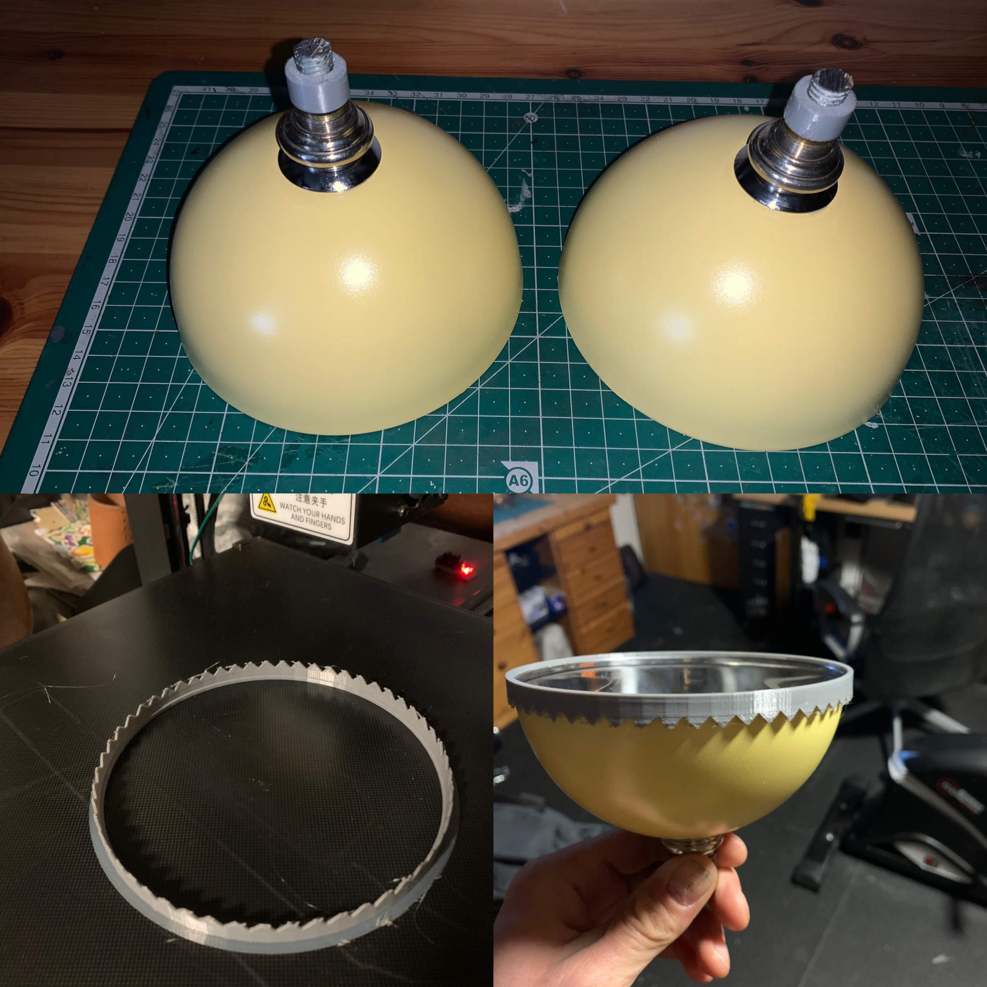 Verbindungsstück zwischen Fuß und Schüssel dient eine Halbrundmutter die mit Epoxykleber befestigt wurde. Dazwischen ist ein Okular eines alten Fernglases und ein Edelstahlring der ein 3D gedrucktes Innenleben hat. In den Fuß wird ein Gewinde geschnitten, so dass er abschaubbar ist.