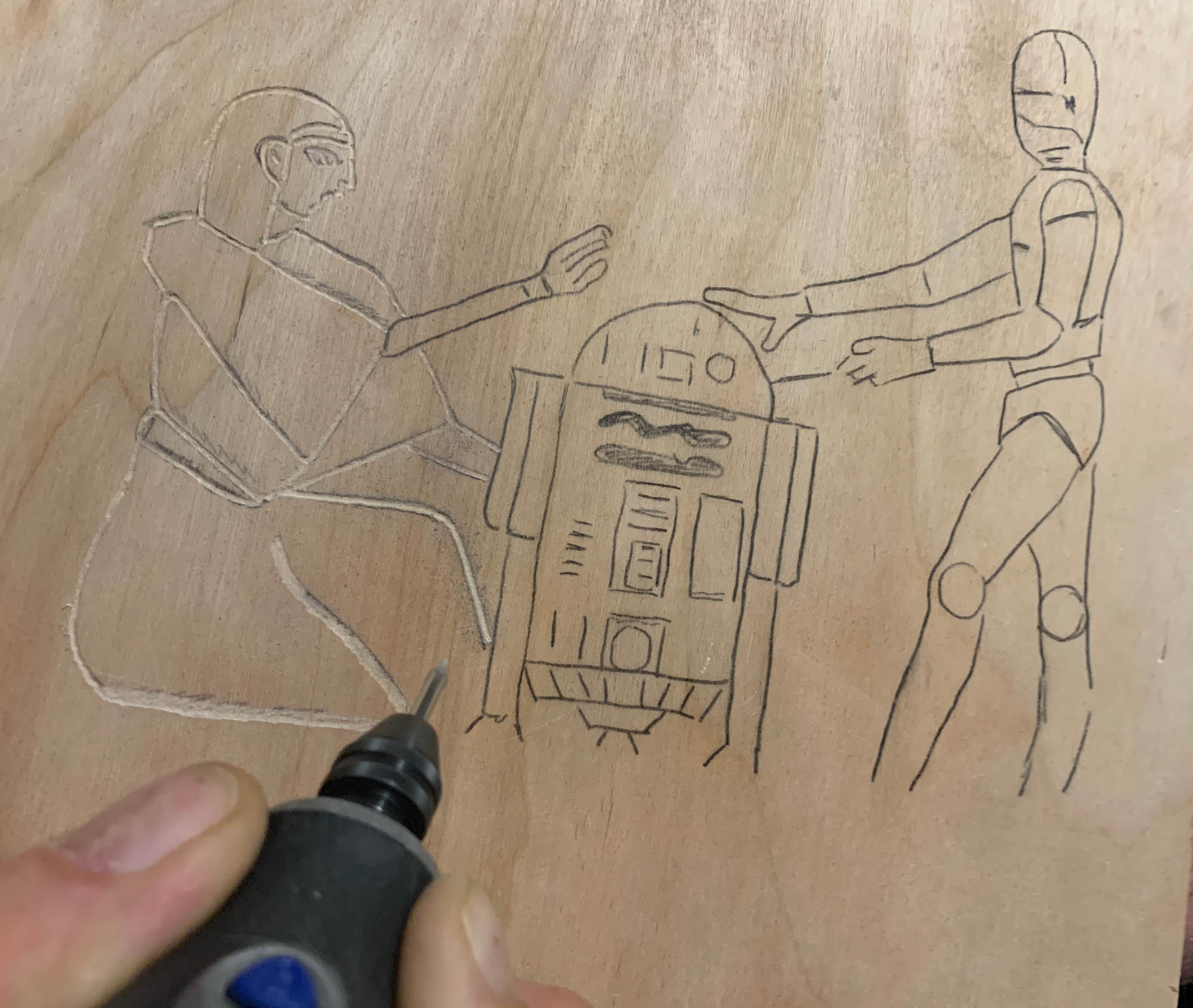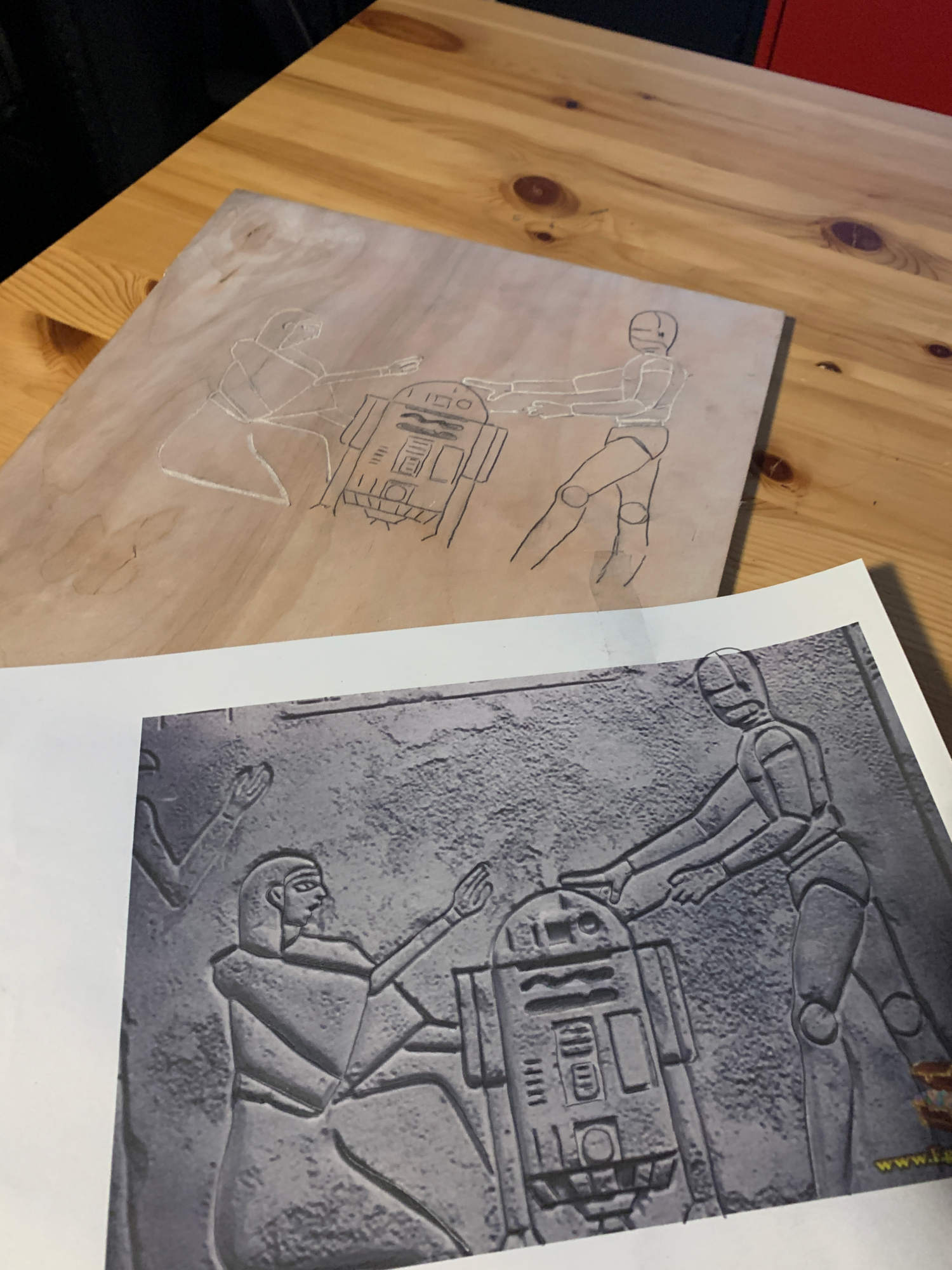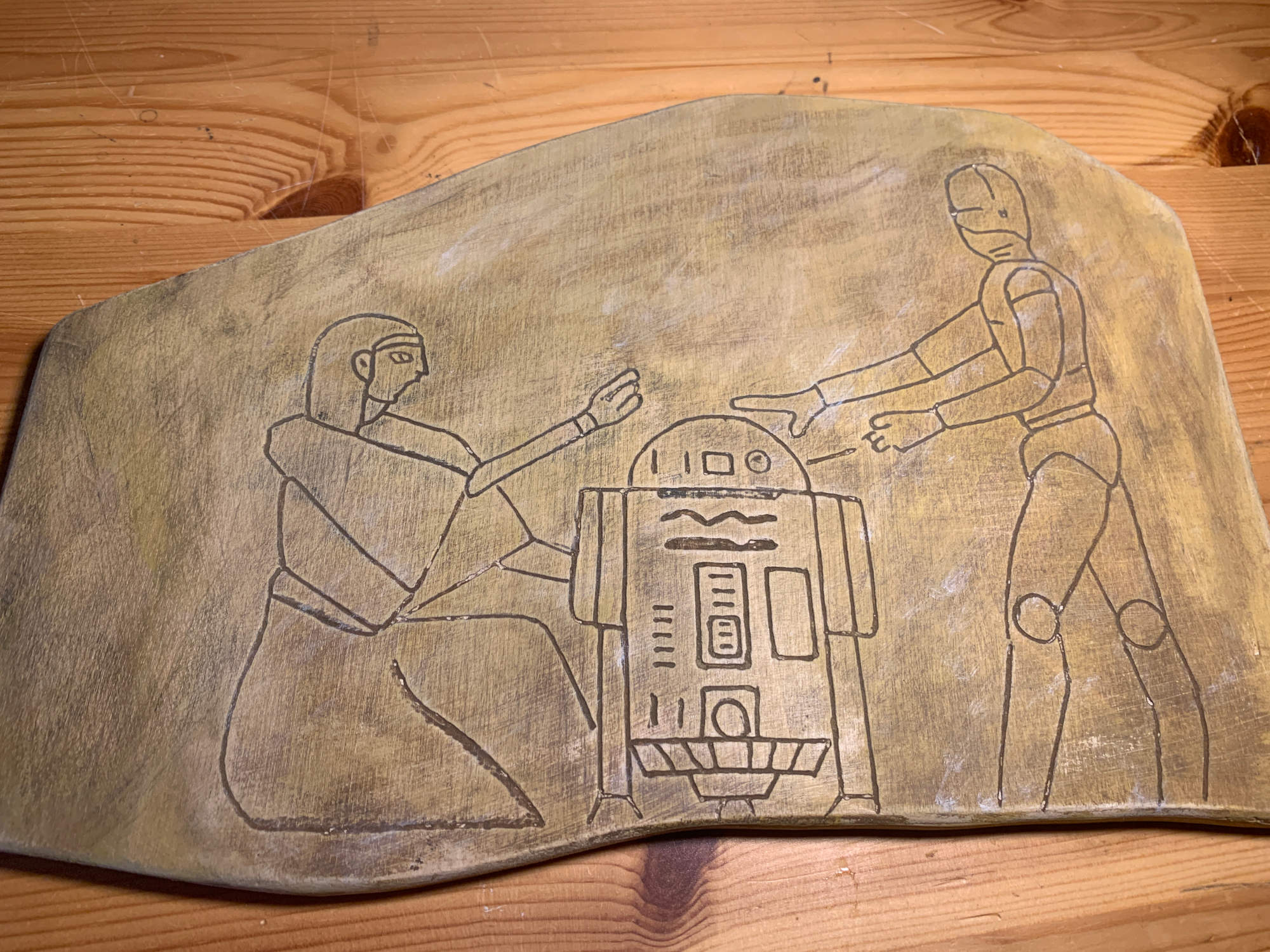 In der Quelle der Seelen Szene ist eine Star War Referenz an der Wand zu sehen die ich versucht habe aus Holz nachzumachen. An der Säule sind normalerweise nur die zwei Droiden zu sehen aber ich habe dieses Bild gefunden welches ich als Gesamtbild sehr schön fand.
