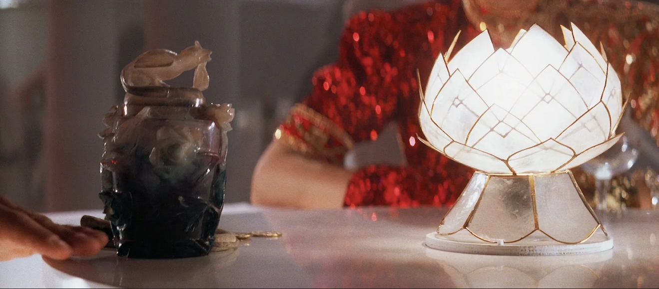 Wikipedia sagt, dass Nurhaci ein Stammesfürst der Jurchen und Begründer der Qing-Dynastie war. Unter seiner Herrschaft wurden die meisten Stämme der Jurchen zu einem offiziell Mandschu genannten Volk vereinigt, welches 1644 die Ming-Dynastie stürzte und damit die Herrschaft über das Kaiserreich China übernahm. Im Film will Indy die Urne gegen den Diamanten "Peacocks Eye" tauschen, der im Besitz des Geschäftsmannes Lao Che ist. Das Material soll wahrscheinlich Jade sein.