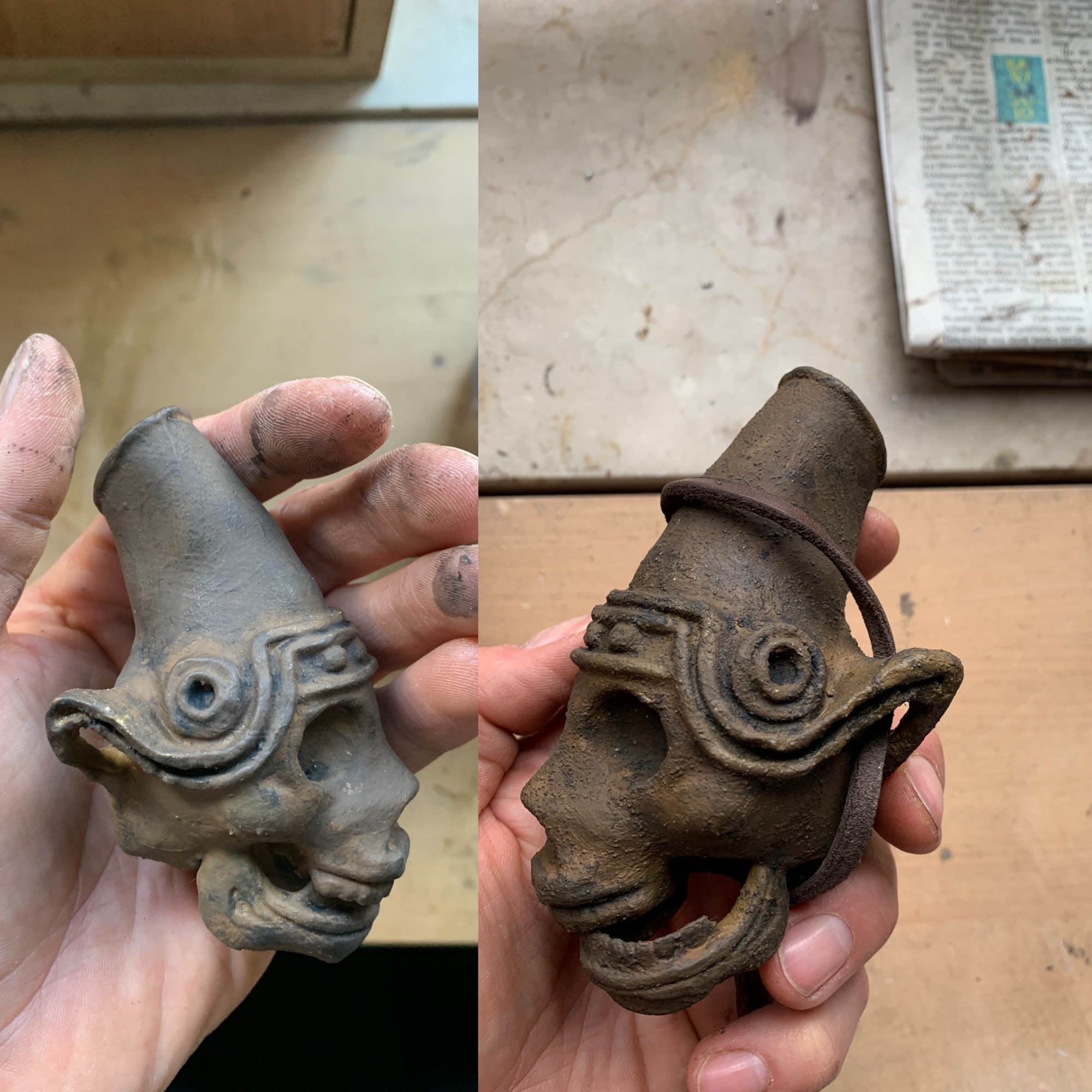 Aztekische Todespfiefe aus Ghostbusters Afterlife, die ich mal gedruckt hatte, fertig machen und habe für meinen Sohn noch eine gemacht. Meine ist etwas größer (fragt mich jetzt nicht warum. Bewusst habe ich nichts geändert)und wurde mit Sandfarbe (mit so Körnchen drin) bemalt und mit Akryfarben gealtert, um besser in meine Sammlung zu passen. In die Kleinere kann man reinpusten und ist mit Revellfarben bemalt und auch gealtert mit Akryfarben. Heulen kann sie natürlich nicht.