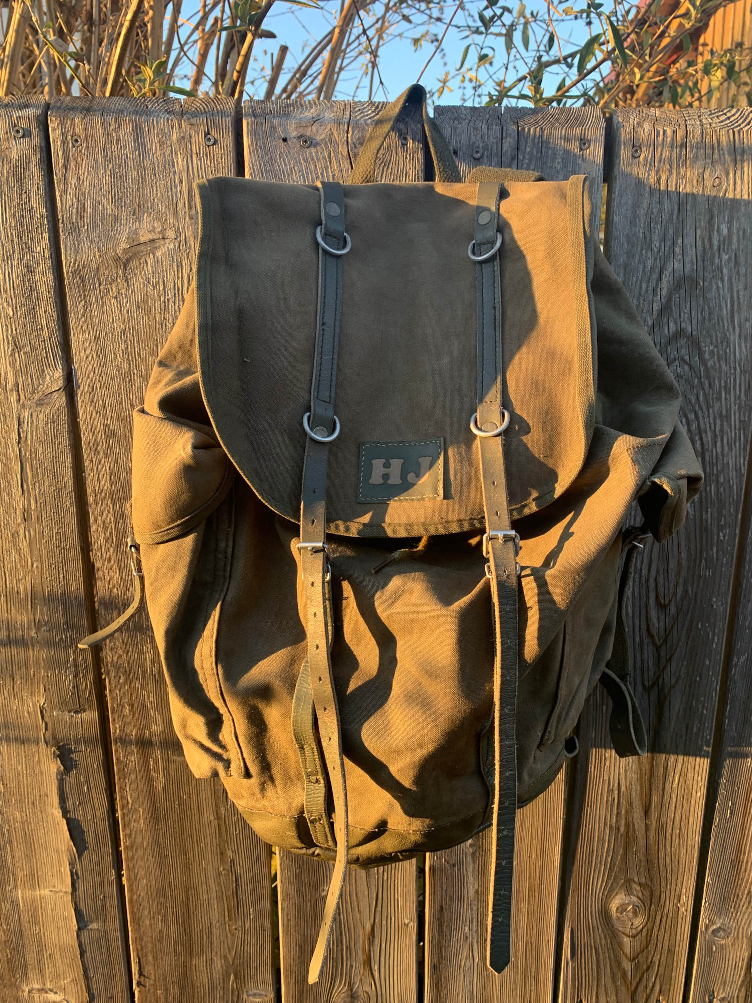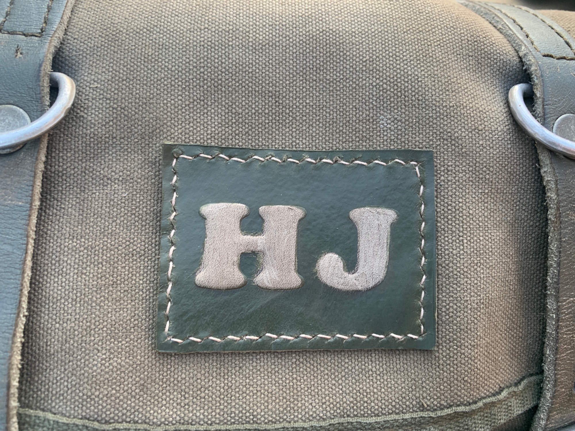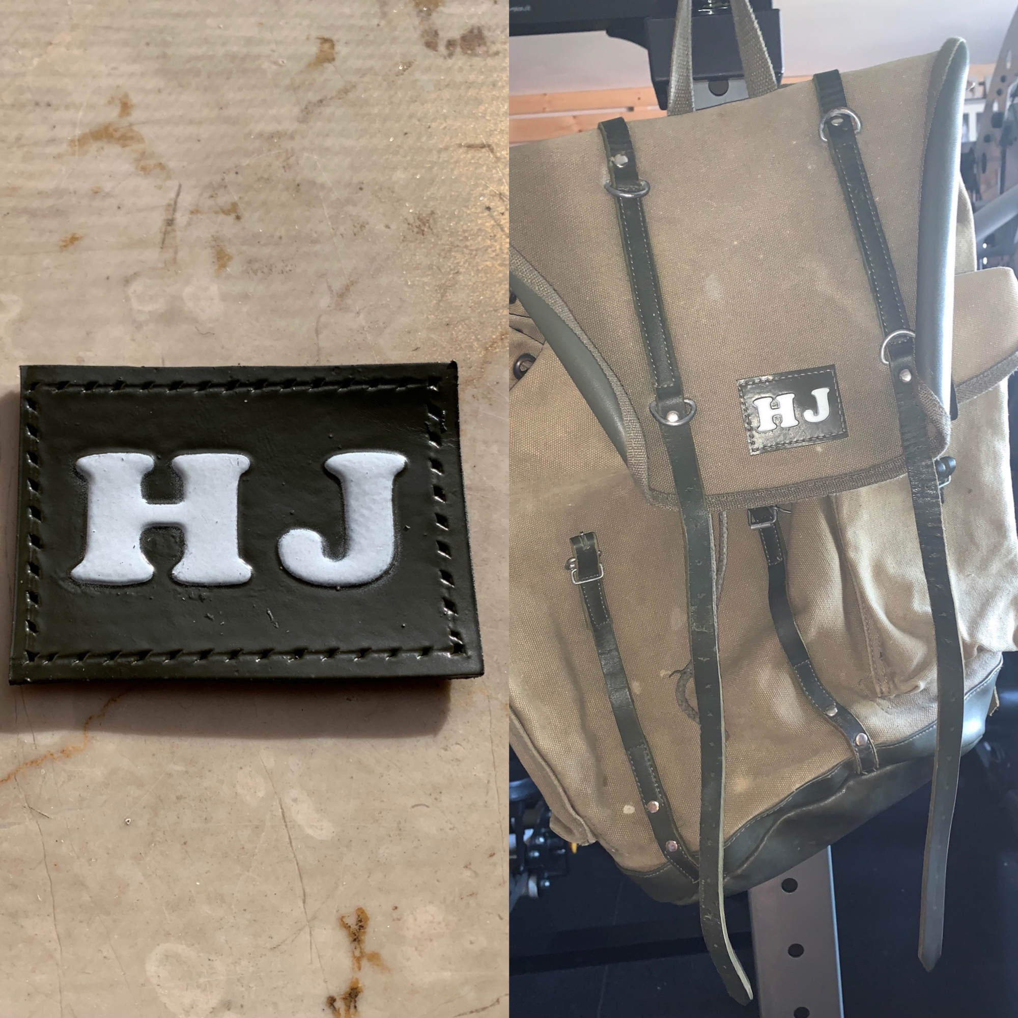 Vor Kurzem habe ich dann versucht das Leder zu lackieren. (In Bundeswehr Oliv mit weißen Buchstaben) Sah ganz gut aus aber der Kontrast war m.M.n. zu krass. Mein aktueller und für mich letzter Versuch, da ich damit zufrieden bin, ist zwar oliv lackiert, jedoch habe ich die Buchstaben ausgespart und nur aufgeraut und dann versiegelt. So werden sie heller aber trotzdem natürlich und ähneln der Farbe des Ricksacks.