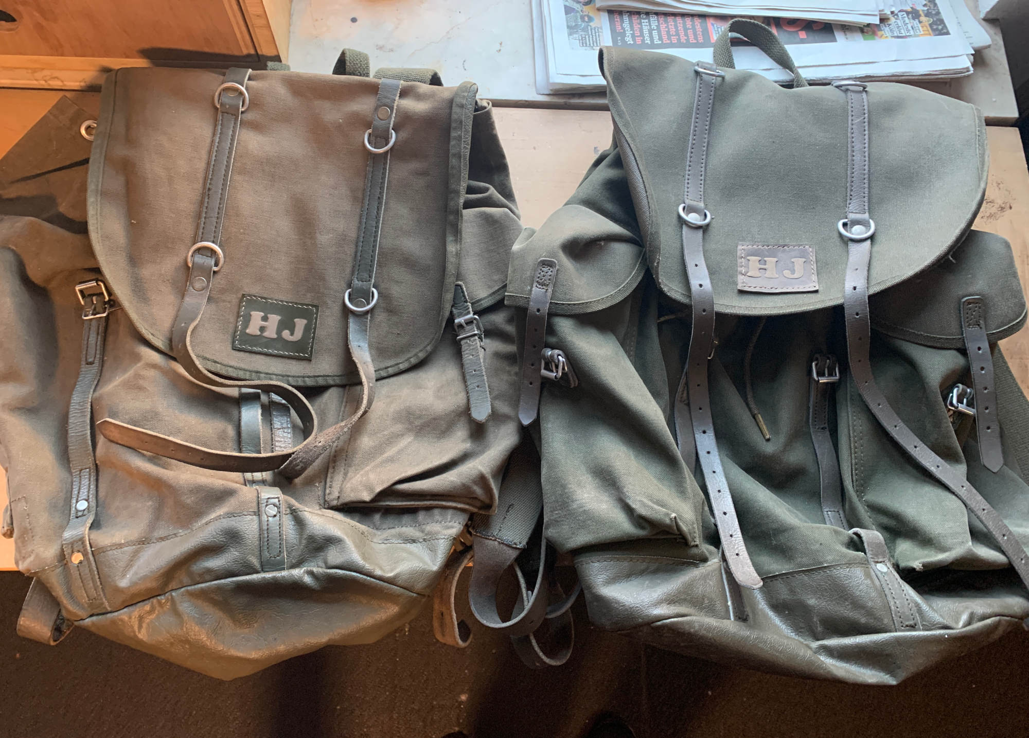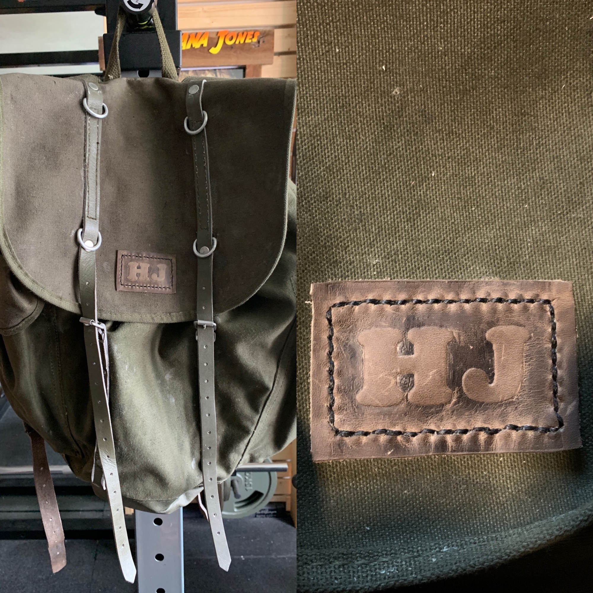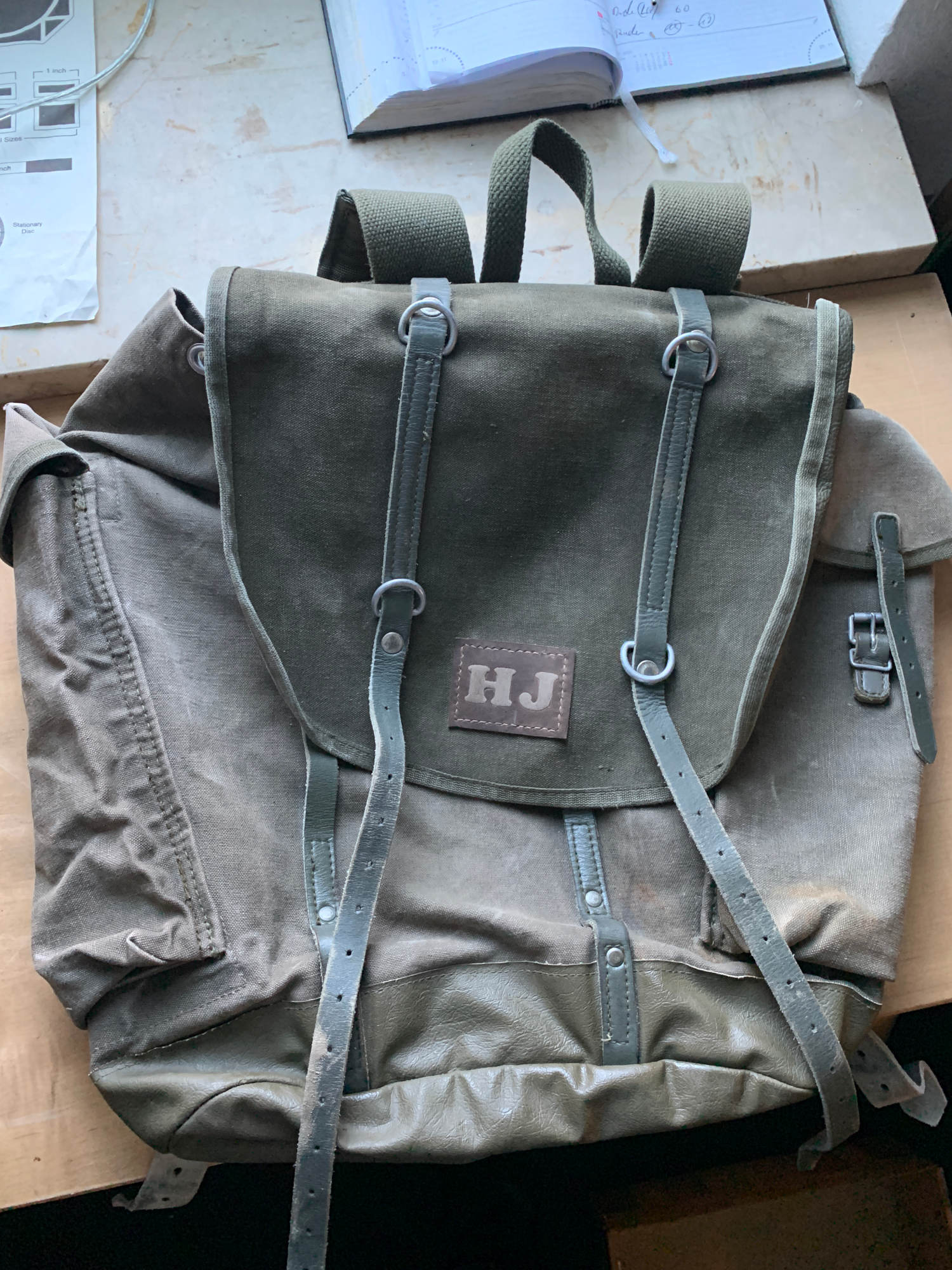 Vor Kurzem habe ich dann versucht das Leder zu lackieren. (In Bundeswehr Oliv mit weißen Buchstaben) Sah ganz gut aus aber der Kontrast war m.M.n. zu krass. Mein aktueller und für mich letzter Versuch, da ich damit zufrieden bin, ist zwar oliv lackiert, jedoch habe ich die Buchstaben ausgespart und nur aufgeraut und dann versiegelt. So werden sie heller aber trotzdem natürlich und ähneln der Farbe des Ricksacks.
