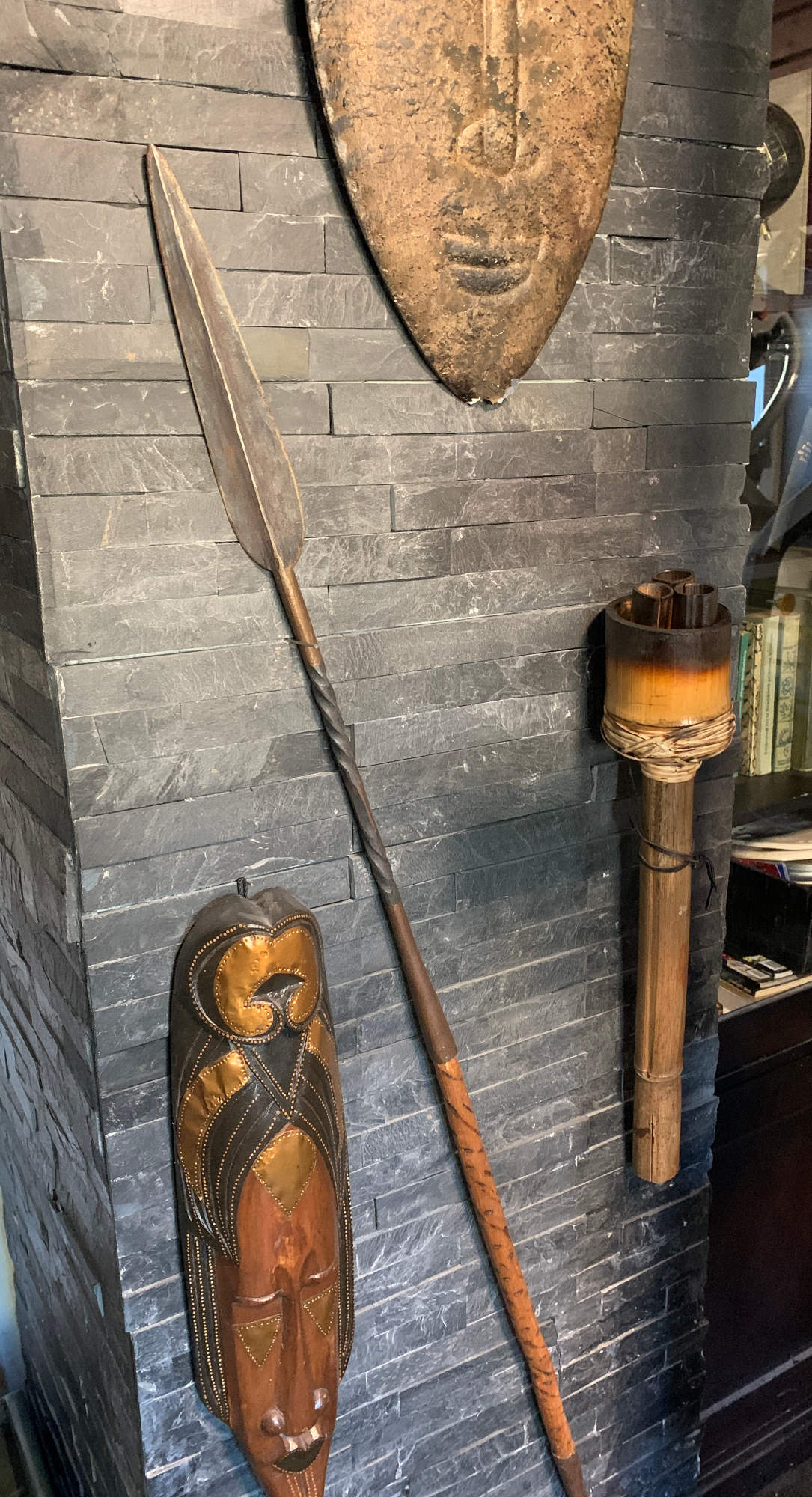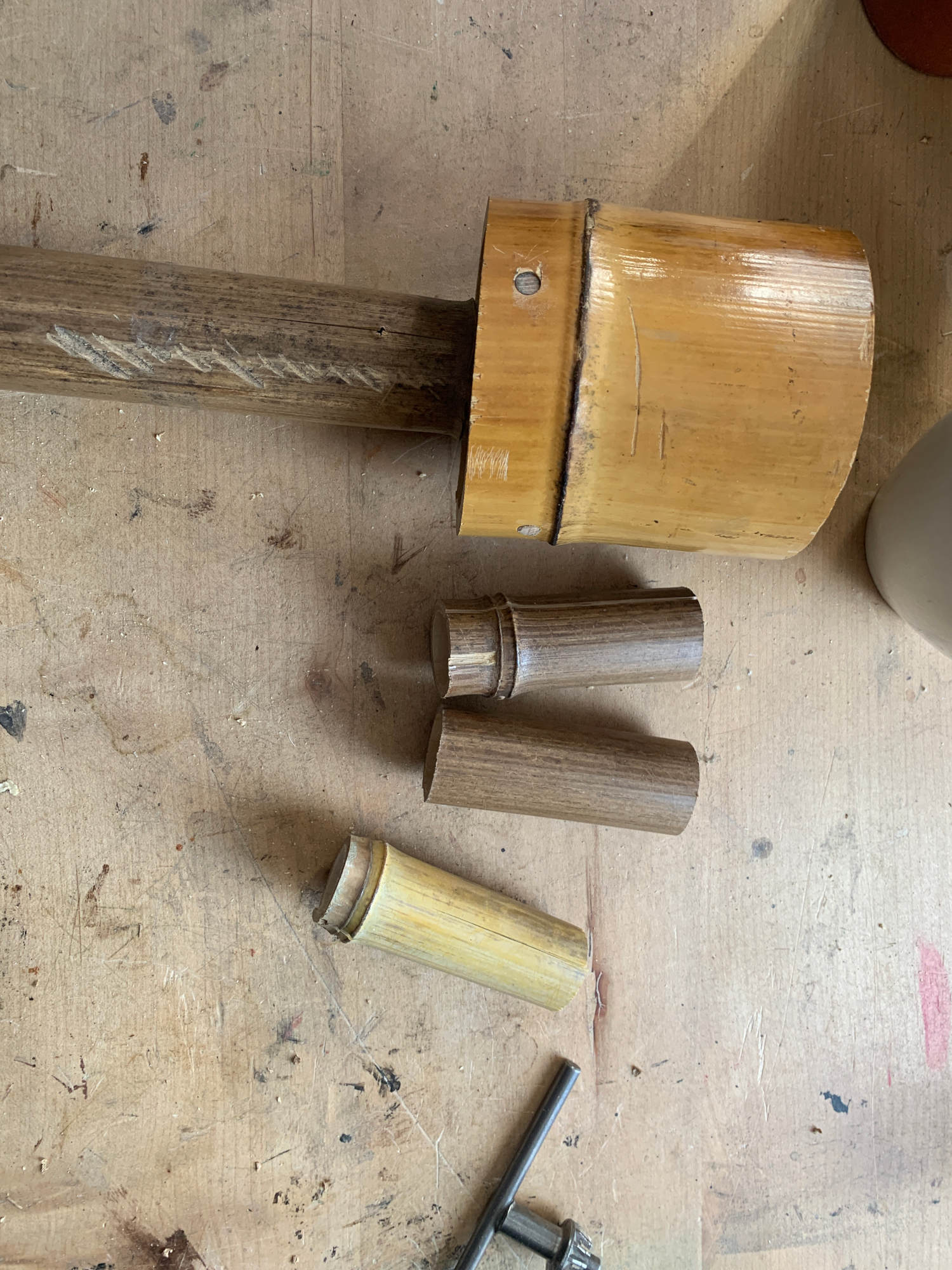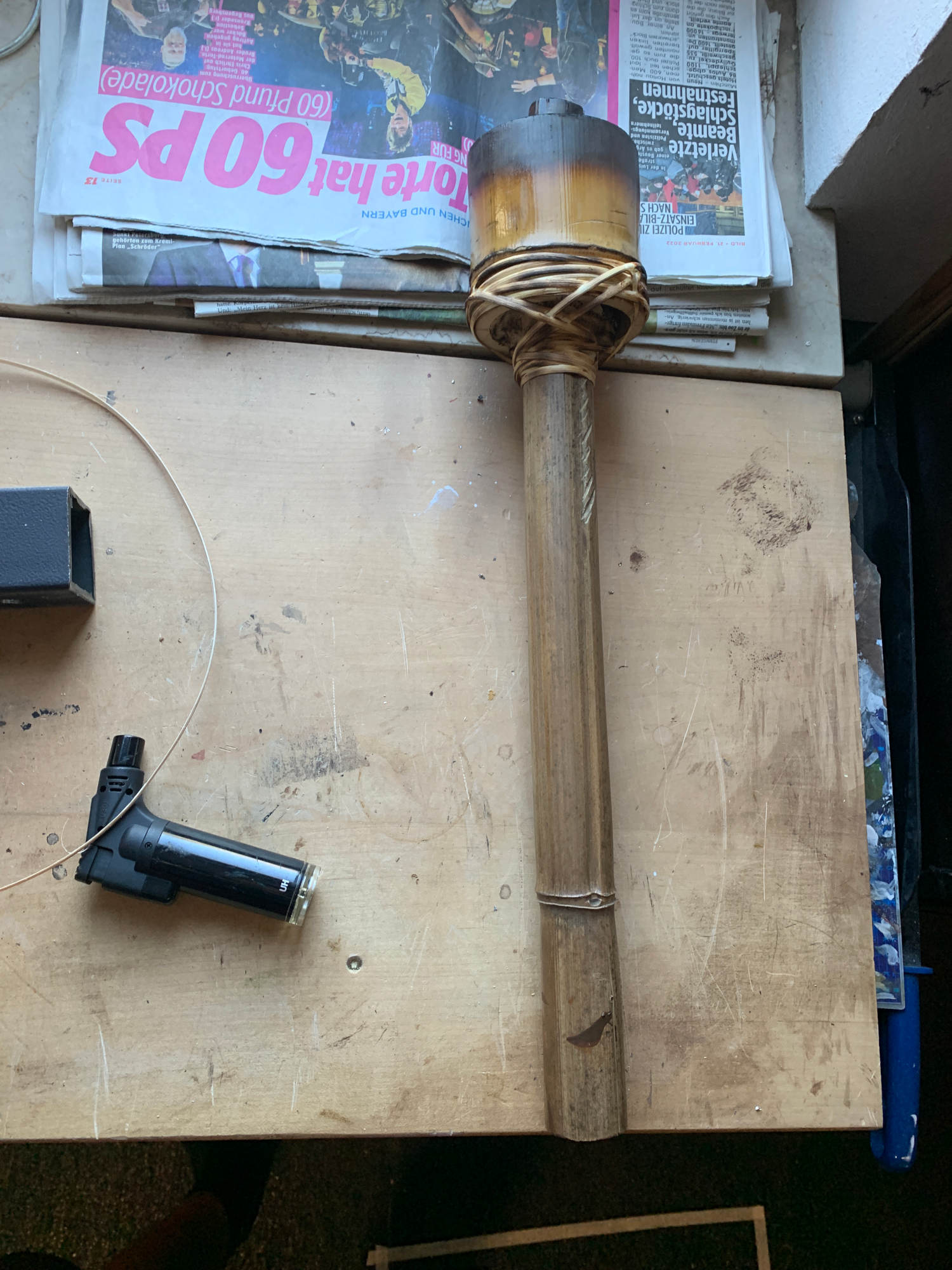 Der Fackelkopf besteht aus einem dicken Stück Bambus, was mal ein Wasserohr war. Der Rest sind kleinere Teile in verschiedenen Größen. Teilweise aus einem Windspiel.