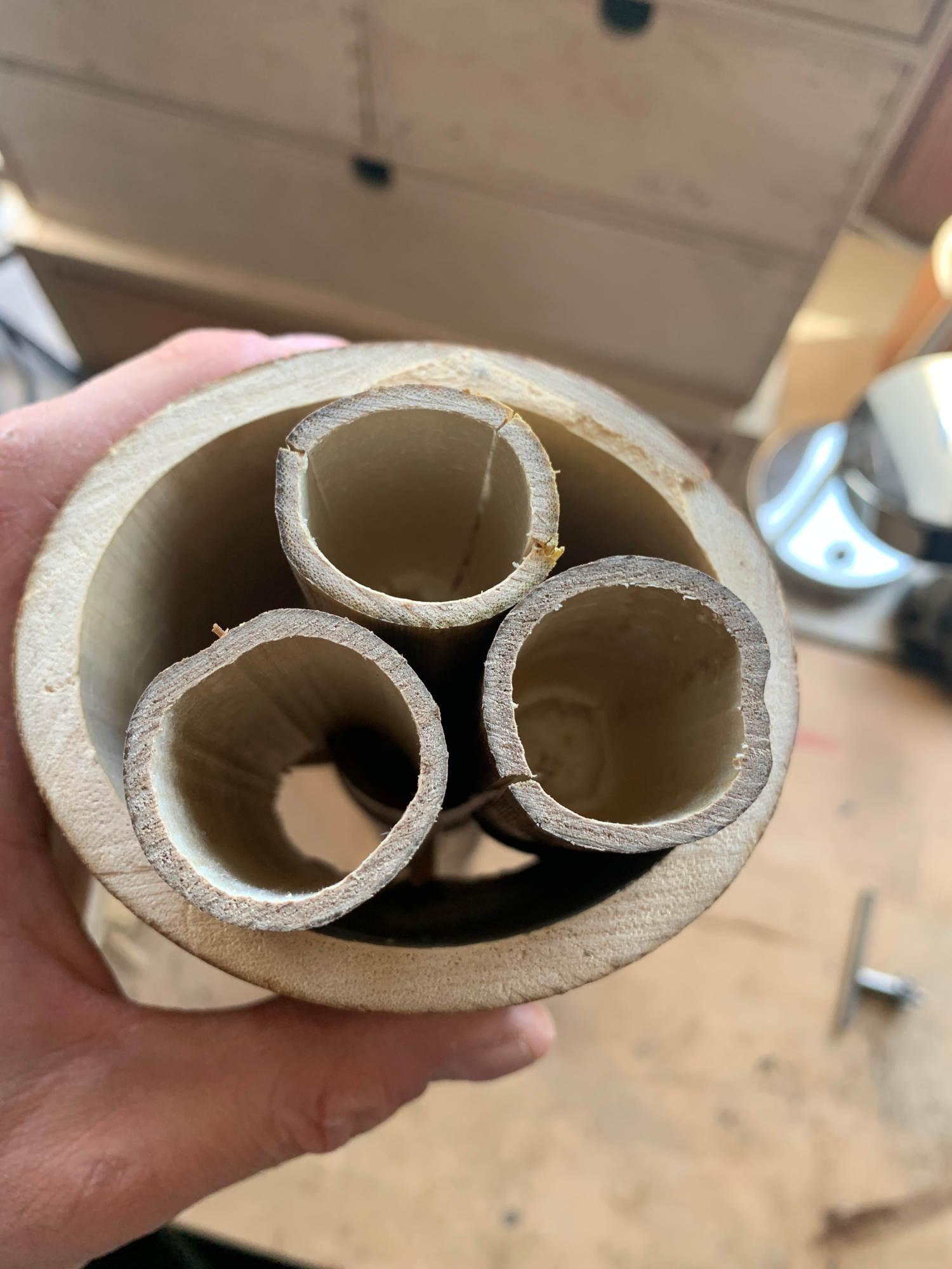 Die 3 Rohrstücke im Inneren sind mit Flechtrohr zusammengebunden und das dicke Bündel dadurch richtig gut eingespannt.