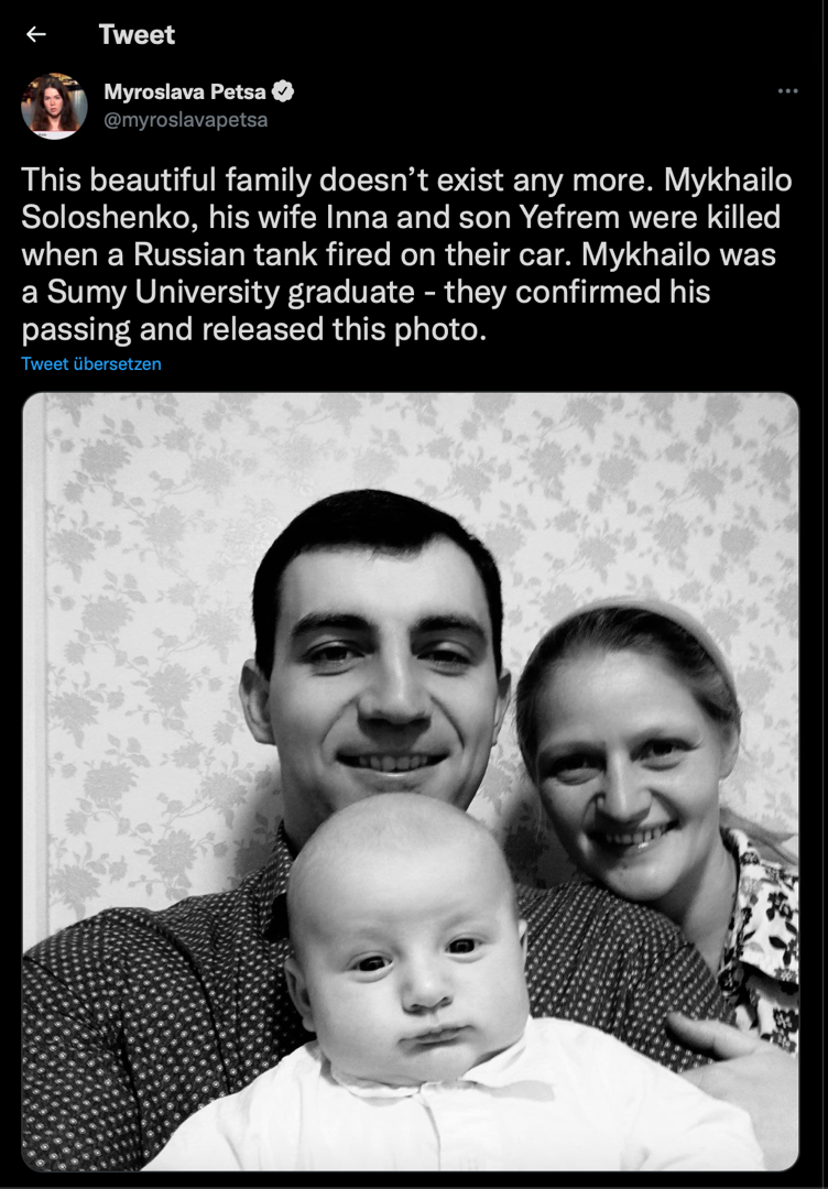 Ich hätte gern, daß irgendjemand den Mut hat, zu Putin zu gehen, und ihm ein Bild dieses Tweets auf den Tisch zu knallen, um ihn zu fragen, wo denn bitte bei seiner "Spezialoperation" nur militärische Ziele angegriffen werden. Und ob das die bösen "Nazis" sind, von denen er die Ukraine befreien möchte. Und die Reaktion darauf würde ich gerne sehen.