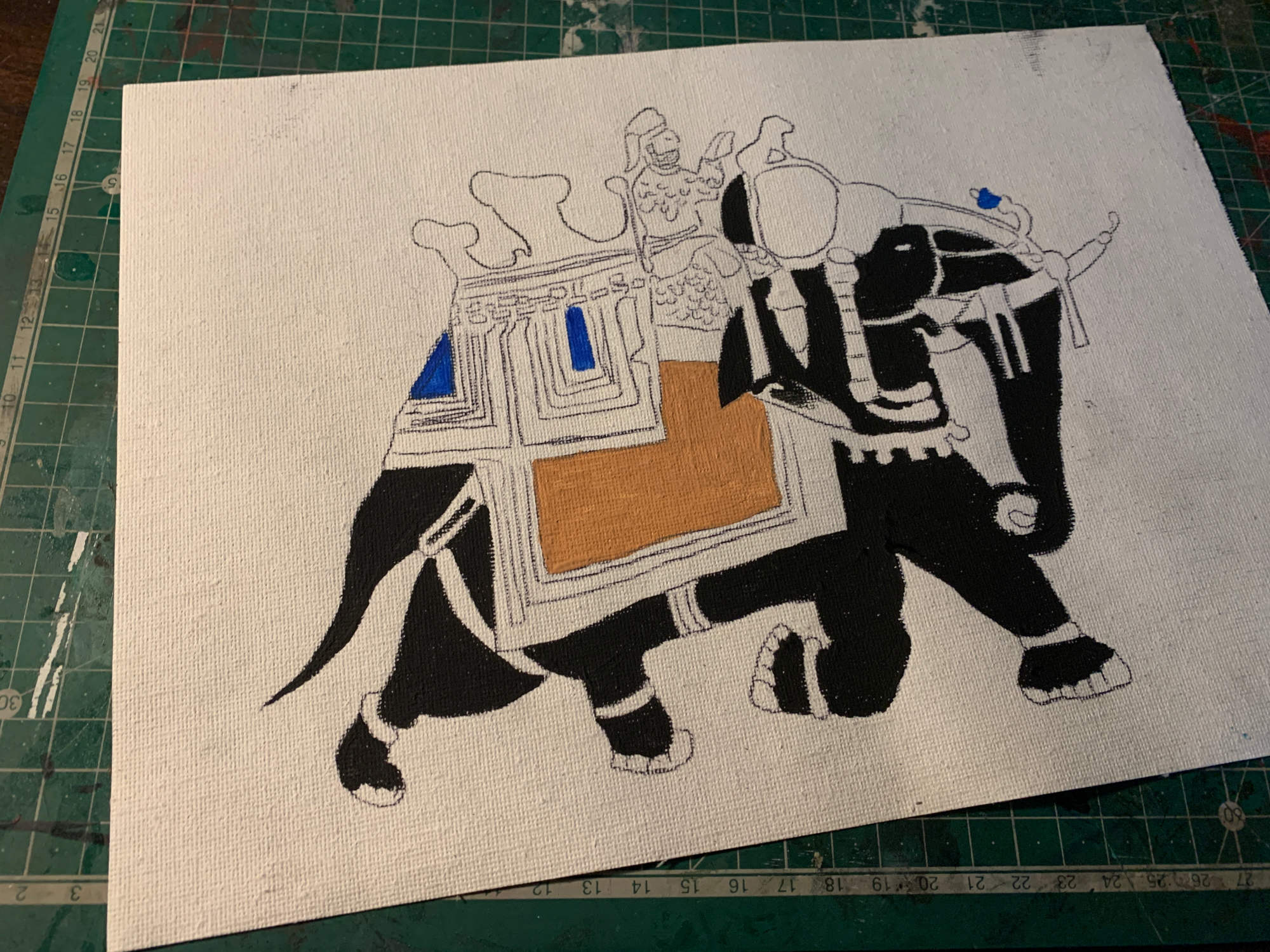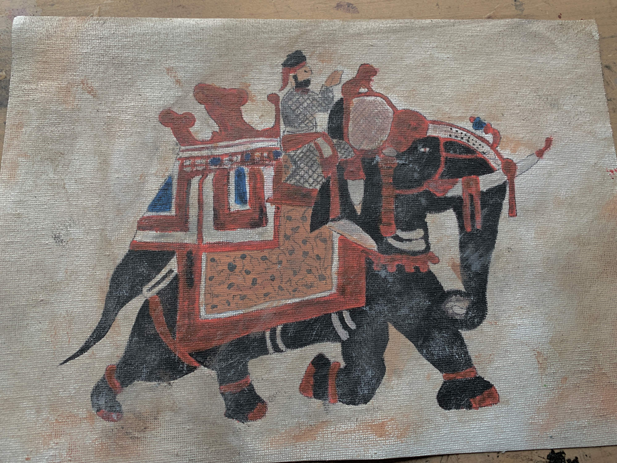 Ist schon wieder in bisschen her aber es geht weiter. Ich hab das Gemälde aus dem Palast von Pankott nachgemalt. Zuerst habe ich ein Bild aus dem Film vergrößert und dann mit Kohlepaier auf ein Blatt Canvas transferiert. Anschlißend mit Akrylfarben gemalt und gealtert.
