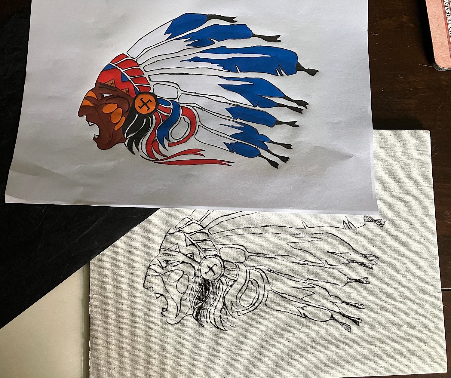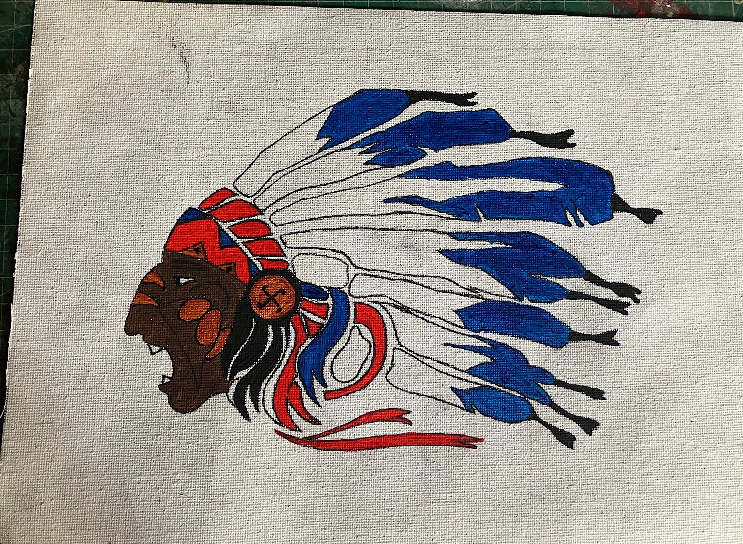 In der Serie Young Indy ist er für zwei Wochen Teil der Lafayette Escandrille oder dem 124th Squadron. Eine Flugeinheit freiwilliger amerikanischer Soldaten, die die französische Armee im 1. Weltkrieg unterstützten. Das Logo der besagten Einheit habe ich mit Kohlepapier auf Leinwandpapier übertragen und mit Akryfarben gemalt.