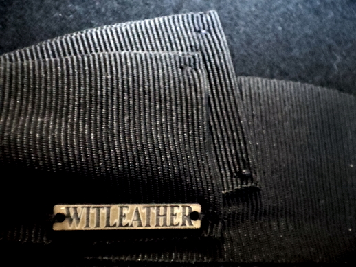 Um die Krone liegt ein 4 cm breites seidenmattes, schwarzes Hutband, das eine Schleife ziert. Daran befindet sich ein matt bronzefarbiges, gebürstetes Emblem mit eingraviertem, schwarz angesetztem Witleather Schriftzug.