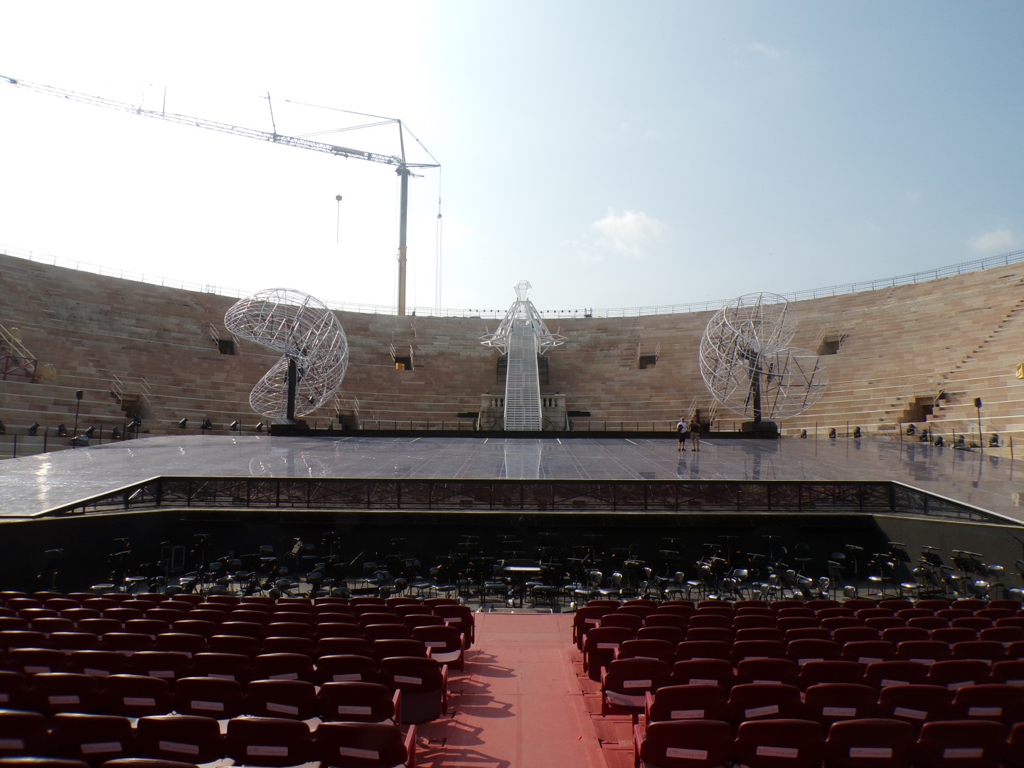 Ein weiteres Amphitheater dieser Güte von Pula steht in Verona. Der rosafarbene Sandstein (Rosso Verona) der Tribünen wird heute sogar noch nach alter Tradition instandgesetzt. Der Abschnitt hinter der Bühne ist wie neu. Die Arena von Verona ist ein gut erhaltenes römisches Amphitheater in Verona, Italien, das im 1. Jahrhundert n. Chr. erbaut wurde. Ursprünglich für Gladiatorenkämpfe und andere öffentliche Veranstaltungen gedacht, ist sie heute ein Wahrzeichen der Stadt und ein bedeutender Veranstaltungsort für Opernaufführungen und Konzerte, insbesondere während der jährlichen Opernfestspiele. Die Arena von Verona bietet Platz für rund 20.000 bis 30.000 Zuschauer, je nachdem, ob es sich um nummerierte Sitzplätze oder Stehplätze handelt. Das Amphitheater ist für seine Größe und die beeindruckende Akustik bekannt.