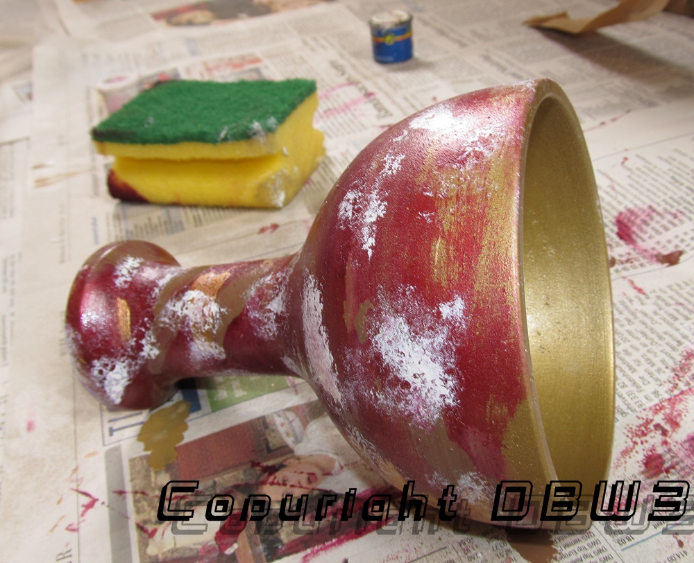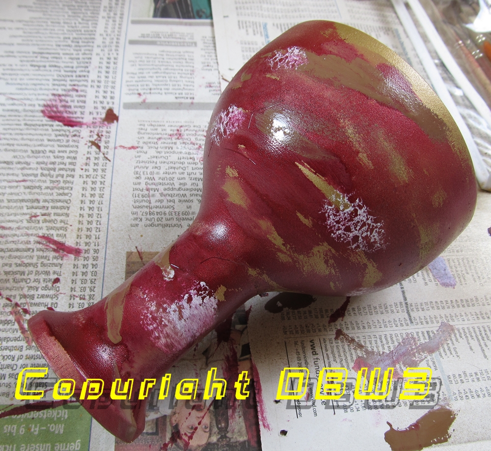 Betreff: Re: Meine Indy-Sammlung Nachden der neue Gral angekommen ist, hier die einzelnen Arbeits(fort-)schritte in Bildern. :-) Jetzt muss das ganze nur noch durchtrocknen und dann kommt noch eine Schicht Klarlack zur Versiegelung drauf. Zunächst habe ich Grundierung aufgetragen; dann Goldfarbe (beides aus der Spraydose). Dann ging es mit so was wie Revellfarben (rot, braun, weiß, etwas gold) an den "Vordergrund". Praktisch alle Stellen, die noch golden sind wurden bei dem Auftragen der roten Farbe einfach ausgelassen, sodass noch die goldene Spraylackierung durchschaut. Die weißen Bereiche wurden mittels eines Küchenschwammes vorsichtig aufgetupft. |