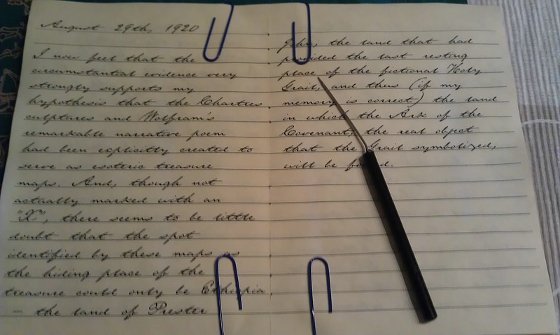 Sieht sehr gut aus, ist ja auch nicht so, dass ich nicht schon angefangen habe, ca. 80 Seiten gibt es ja bereits auf dem PC. Aber mal schauen, wie ich da weitermache... Auch euch vielen Dank, IndyTom und MurdocXXL. Noch einige Details zum Buch: - es besitzt 7 Signaturen mit je 24 Seiten - insgesamt sind es 168 Seiten, wobei die letzten 14 Seiten leer sind - Abner Ravenwood hat 132 Seiten beschrieben und Indy hat noch 19 Seiten hinzugefügt, nachdem er es erhalten hatte - der Abner Ravenwood Text stammt (wie oben schon erwähnt) von Bryan Babich - der Indy Text stammt von einer COW-Seite (Additional pages to Abner Ravenwoods Raiders Journal) - bis jetzt habe ich 3 Inserts hinzugefügt (Brief von Atif, Karte von Indien und Karte von der Tanis) Und hier die angekündigten Fotos: |