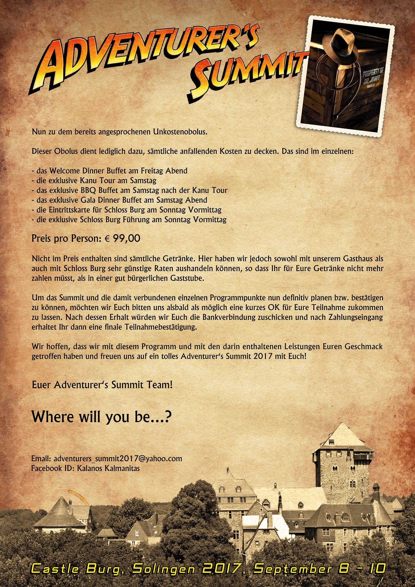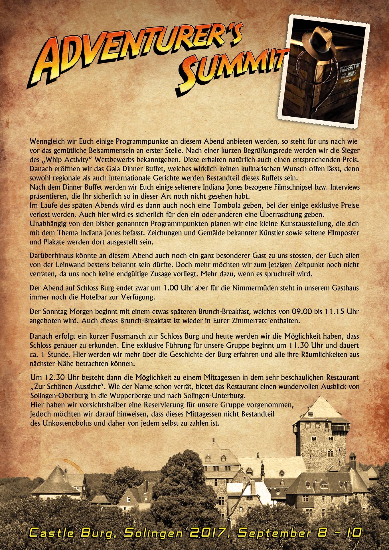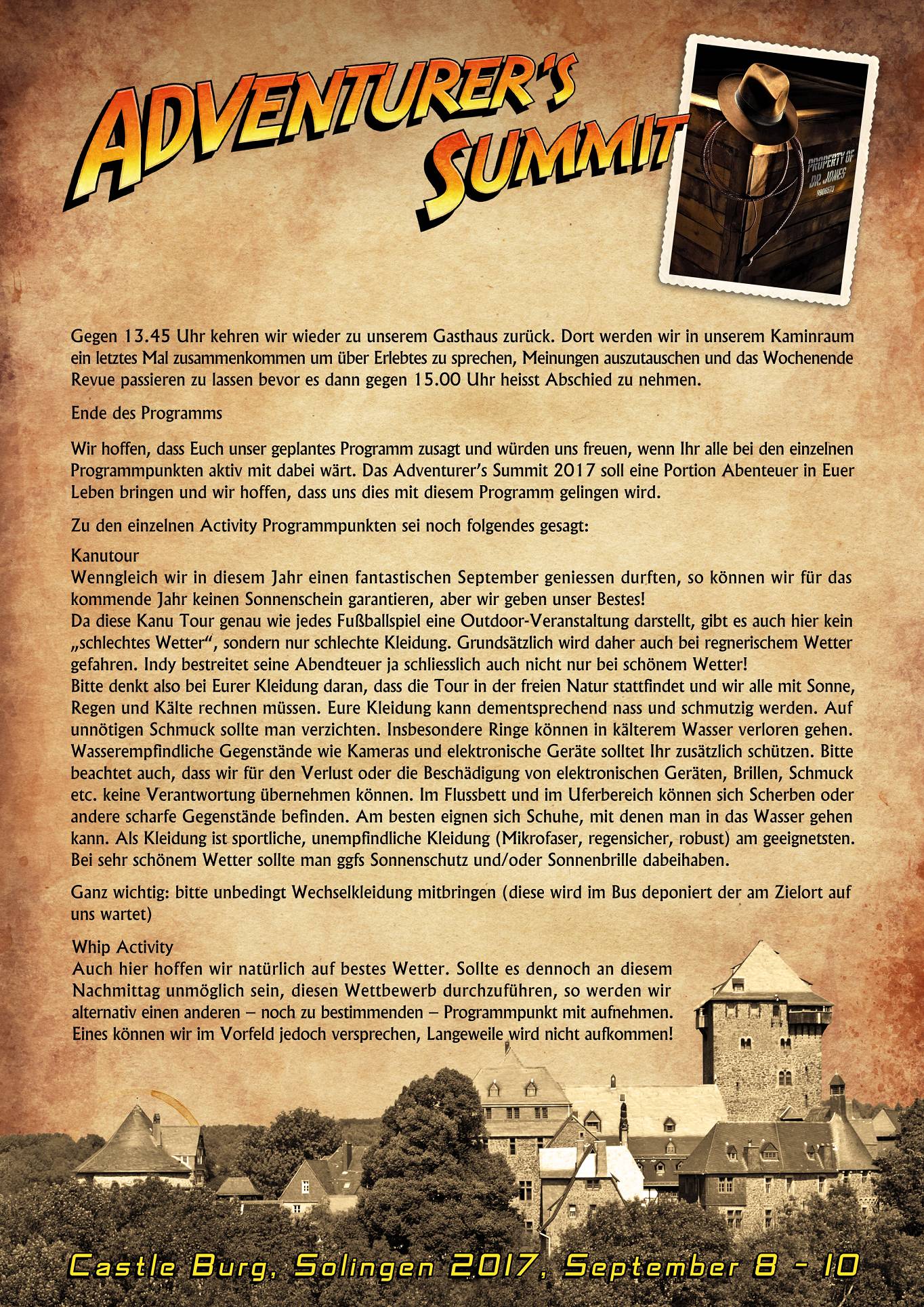 Betreff: Re: Adventurer’s Summit 2017 Schloss Burg, Solingen – Teilnehmerliste & Programm An alle Summit Teilnehmer! Hier nun die ersten genauen Infos zum Programmablauf des Adventurer's Summit 2017 sowie zum bereits angekündigten Unkostenobolus, der zur Durchführung des geplanten Programms pro Kopf anfallen wird. Wir möchten Euch bitten, diese Infos genau durchzulesen und uns kurzfristig Euer OK zukommen zu lassen, damit wir sämtliche Programmpunkte "festzurren" können. Wir hoffen, wir haben Euren Geschmack getroffen und freuen uns auf Eure Rückmeldung! Euer Adventurer's Summit Team! Ps: Sorry, dass der Programmablauf nicht in einem Dokument dargestellt werden kann. |