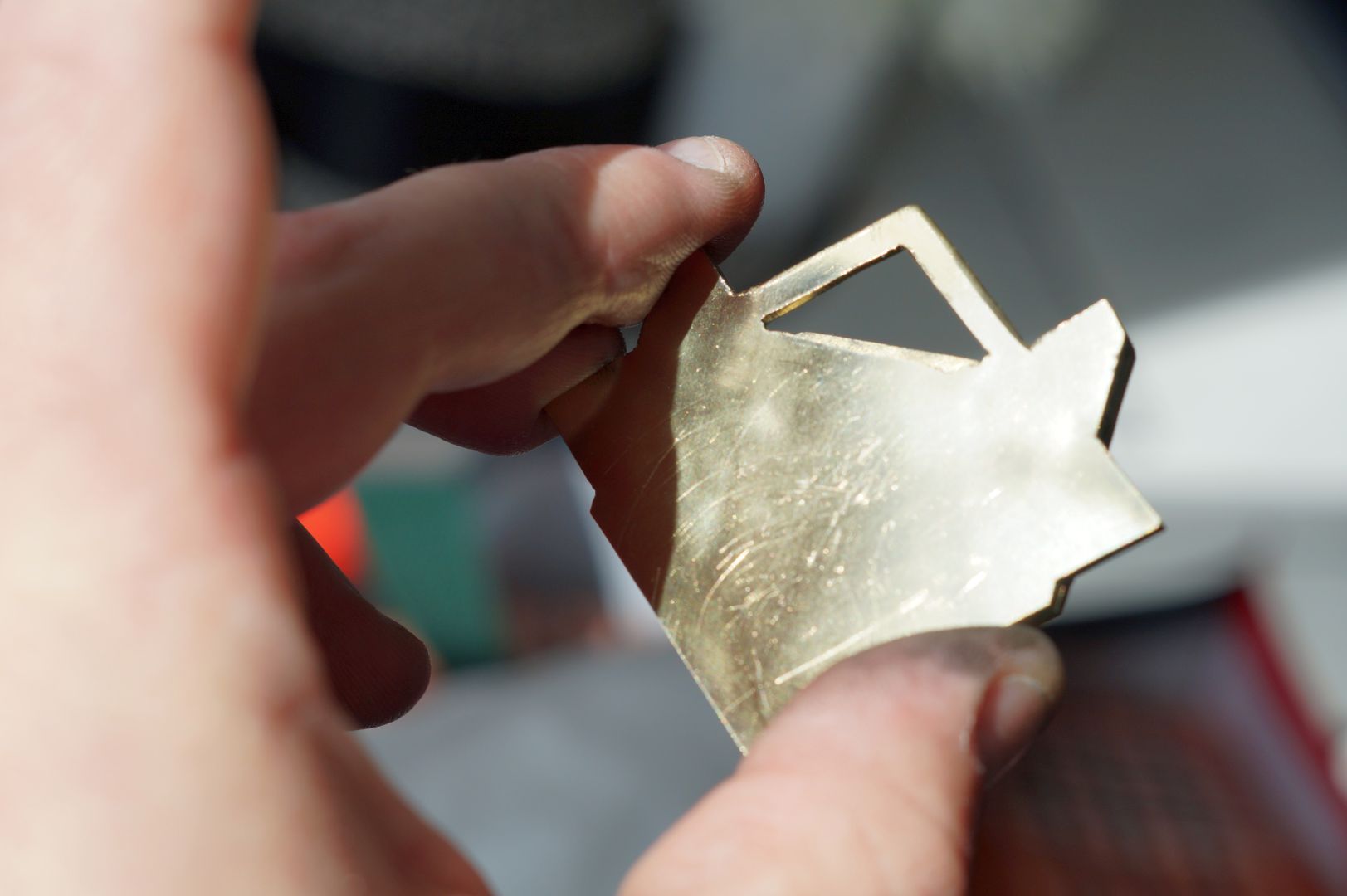 Betreff: Re: Fate of Atlantis - Nur Ab Sals Amulett Nun ging es los. Mit dem Bastelskalpell wurde ein Exemplar vom Ausdruck (voriger Post) ausgeschnitten - Anmerkung an mich: Vorsichtig und mit Geduld, damit das Papier nicht einreißt... Das Abpausen mittels der Stahlnadel war Anfangs eine echte Plackerei ("Im Rahmen seiner Fähigkeiten war er stets bemüht..." - Wem Arbeitszeugnis-Deutsch ein Begriff ist ;-)) Was ich euch mit auf den Weg geben kann: * Schutzfolie des Metalls entfernen! * Nicht (In Worten "nicht") ungeduldig werden! Das wirkte im ersten Moment nicht weiter schwierig und auf dem Foto kann man auch erkennen, dass die Markierungen recht plausibel aussahen. Dazu komme ich dann aber später noch mal. Nun ging es also daran, den ersten Teil auszusägen. Toitoitoi, dachte ich, da ich natürlich nicht wusste, ob man das 2 mm starke Messing einfach so sägen kann. Aber tadaaa - Es ging. Es dauert zwar, aber es funktioniert. Was ich euch hier mit auf den Weg geben kann: * Deckt euch mit Sägeblättern ein! Ich habe mittlerweile geschätzt eine Strecke von 30 cm gesägt und schon 15 davon verschlissen. * Safety first! Nie ohne Schutzbrille. So ein abgebrochenes Sägeblatt oder ein Stück Messing eitern schlecht aus dem Auge raus! Der Ausschnitt war natürlich noch relativ roh. Nichtsdestotrotz sollte man schon beim Aussägen so genau wie möglich arbeiten, um später nicht beim Feilen zu verzweifeln. Zurück kommend zur Ankündigung weiter oben: Ich es tatsächlich geschafft, nicht einmal diese simplen Formen korrekt abzupausen. Heißt - Das Gesicht und die Grundplatte passten nicht. Das Gesicht (Der Teil mit Mund und Augen) ist asymmetrisch - WUUUHAAAAAAAA. Man kann es auf dem einen Bild sehen. Achtet auf das linke Auge, dass in einer Flucht mit den Ohren sein sollte. Wie auch immer - Grandios, gleich noch mal. Aber wir lernen natürlich aus unseren Fehlern. Es ist nämlich so, dass nicht nur das Gesicht falsch war, sondern schon die Grundplatte. OMG... Daher habe ich das Abpausen des Gesichts beim nächsten Versuch basierend auf der Grundplatte angefangen. Man merkt eben doch die fehlende Erfahrung. Aber was soll's - Es hat letzten Endes doch funktioniert und das ist es, was zählt:-) |