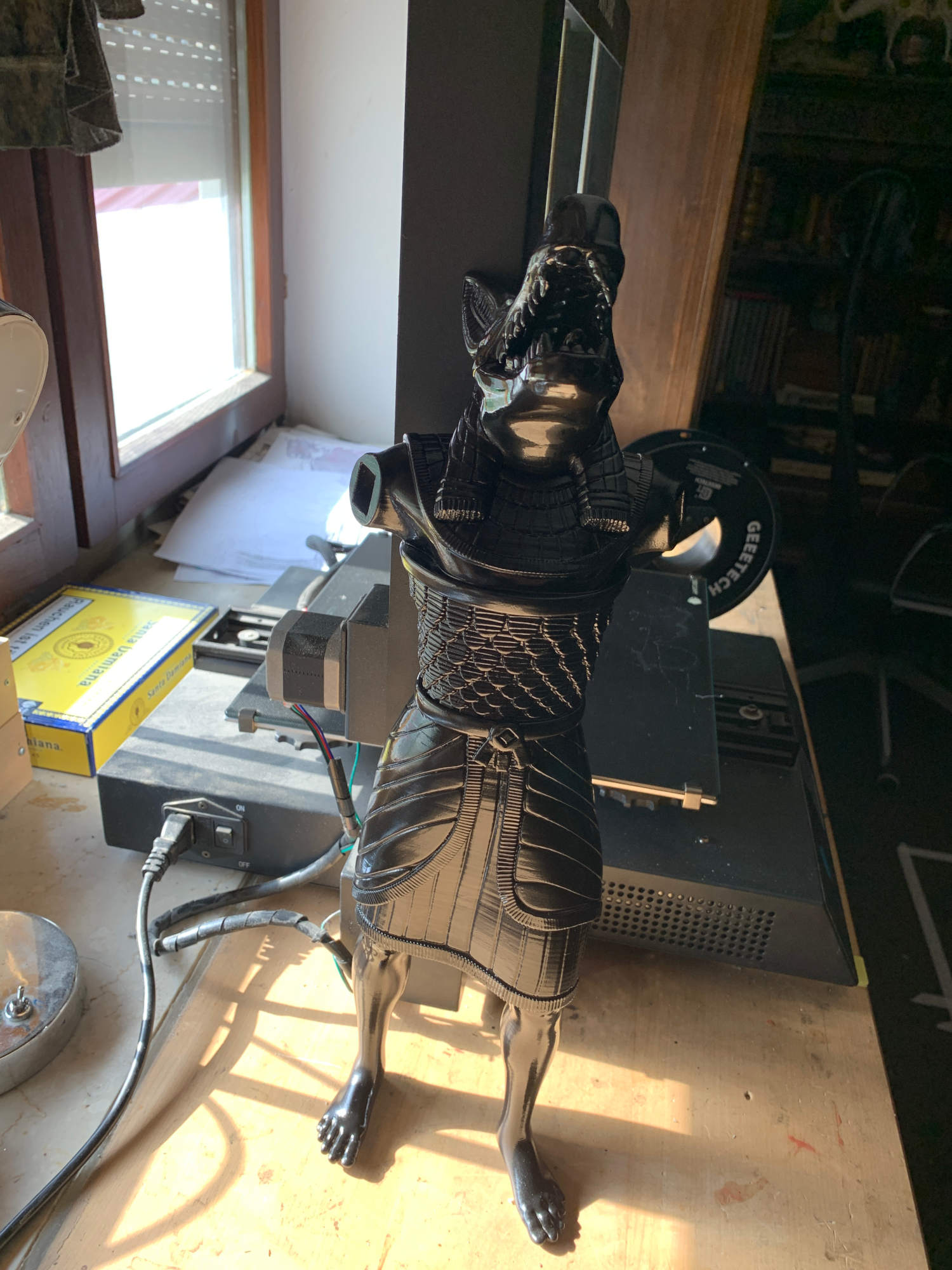 Betreff: Re: Projekte So, nun ein Projekt aus der Schleifhölle. Es ist schon ewig her, dass ich die Datei mal ertauscht habe, wusste aber nie was ich damit anfangen soll. Es handelt sich um die Anubisstatue aus der Well of Souls aus Raiders. Ich hatte zwar schon irgendwann mal die Idee sie einfach ins Display zu stellen aber dann kam jedesmal die Motivation dazwischen das Ding zu schleifen und zu spachteln. An ein zwei Ecken braucht es das immer noch aber vorerst kann ich damit leben. Und weil bei meinem Drucker ein Teil getauscht werden muss kommt der Arm auch später nach. Ich werde nur einen Drucken, da es sonst nicht passt und man ihn eh nicht sehen würde. Die Statue ist 45cm hoch, ist lackiert und anschließend mit Öl- und Akrylfarben gealtert. -Update- Zwei Arme |