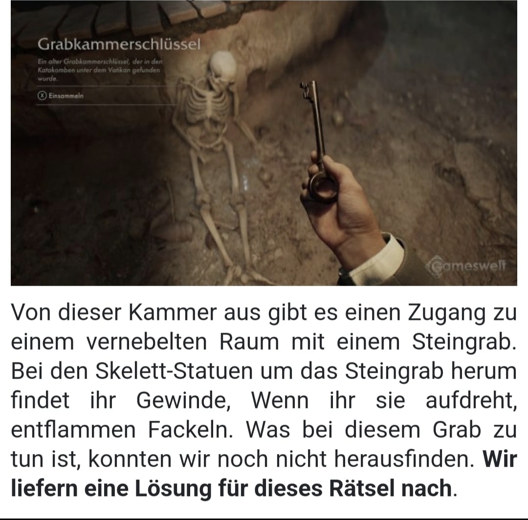Betreff: Re: Bethesda/MachineGames „Indiana Jones and the great Circle“ (milde Spoiler) Es gibt ein Rätsel, das nicht offiziell ist (weil nirgends erwähnt) ich es immer übersehen habe. Im Vatikan Untergrund gibt es einen runden Raum mit einem Sarkophag. Drum herum sind in den Wänden Skelette im Gewand abgebildet. Jedes Skelett hält eine Petroleumlampe, die durch das Drehen nach links aktiviert wird. Über jeden der Skelette steht eine römische Zahl; angefangen mit I und aufhörend mit X. Weiß jemand, wie man den Sarkophag öffnet? Ich glaube, man muss bestimmte Lampen anmachen, vielleicht sogar auch in einer bestimmten Reihenfolge. Aber, wie gesagt, ich habe in keiner Notiz dazu etwas gefunden. Und es ist kein offizielles Rätsel. |
