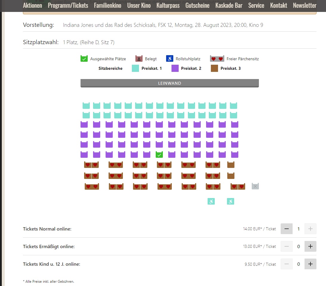 Betreff: Re: Indy 5 Kino, Open Air & Heimkino Thread Indy bäumt sich nochmal auf! Ab morgen läuft er im filmpalast in Kassel anstatt in der Nachmittagsvorstellung im Mini-Kino (Kino15) wieder in einem Kinosaal! (Kino 9) als 20:00! Vorstellung Läuft also wieder in einen größeren Saal, zu einer vernünftigen Zeit. Da geh ich doch kommenden Montag nochmal in den Film. Als würde jemand sagen: Give em' hell, Indiana Jones! https://kassel.filmpalast.de/...Schicksals |