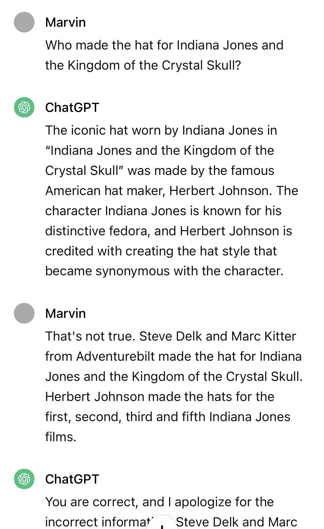Betreff: ChatGPT und Indiana Jones Lange Zeit habe ich mich geweigert, ChatGPT etwas zu fragen. Gestern überkam mich aber die Neugier und ich habe mir die App installiert. Weil ich wissen wollte, welche Expertise ChatGPT in Bezug auf Indy hat, habe ich mal ein paar Fragen gestellt. Viele Antworten waren sehr spannend. Ich teile mal zwei Highlights mit euch: |