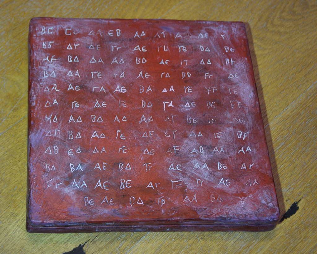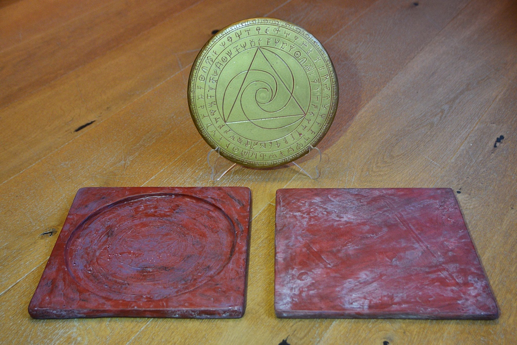 Alles ist handgemacht. Die Box besteht aus Holz, Gießharz und Modelliermasse, die Scheibe selbst aus Gießharz; dazu mehrere Farbschichten und Washes.