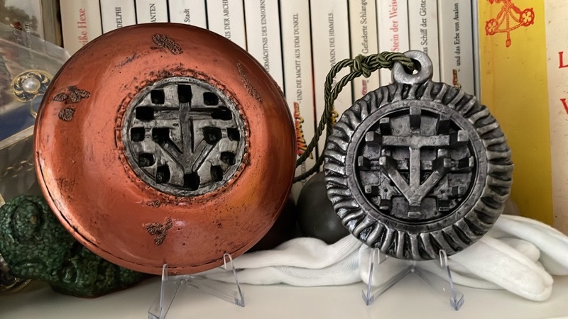 Es ist aus Resin und kommt mit Gegenstelle, in die man das Medaillon auch hineinstecken kann.