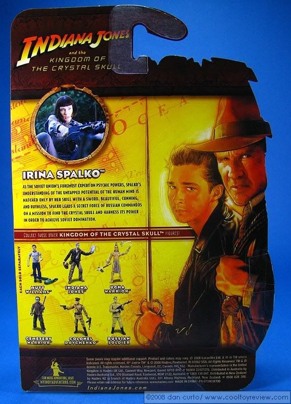 "Raised in a superstitious Ukranian village, where her psychic abilities led her being branded a 'witch', Irina Spalko was handpicked by Stalin to oversee research into psychic warfare. A former member of the KGB's Science and Technology Directorate, Spalko has been decorated with the Order of Lenin, Her powers of intuition have taken her a long way from the experiments she performed on animals as a teenager. As voracious a seeker of truth as any Indy has ever met, Spalko shows there is no limit to how far she is prepared to go to achieve her goals. Her expertise with the saber, rapier, and foil drives the point home"