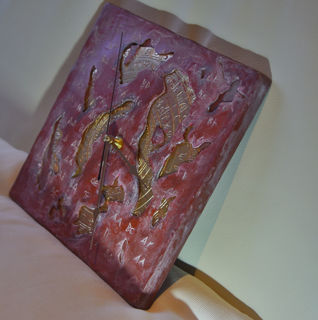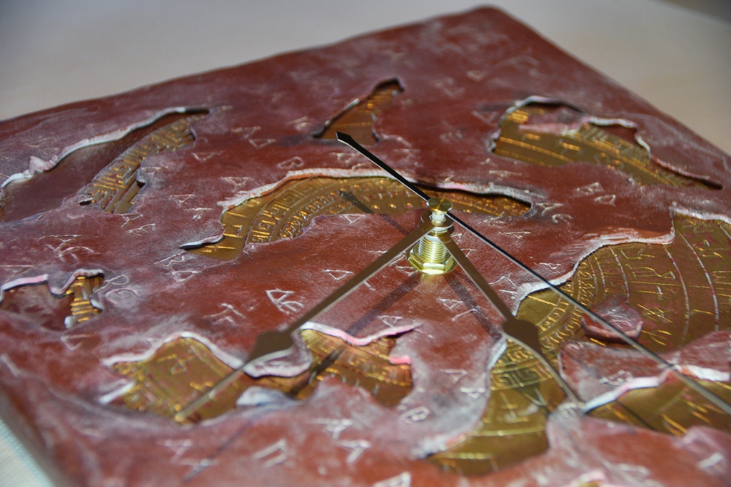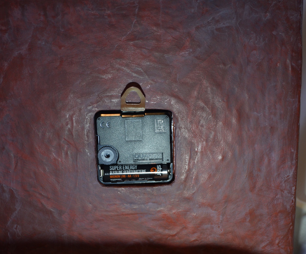 Eingebaut ist ein kleines Uhrwerk mit goldenfarbenen Stunden-und Minutenzeiger, sowie schwarzem Sekundenzeiger.