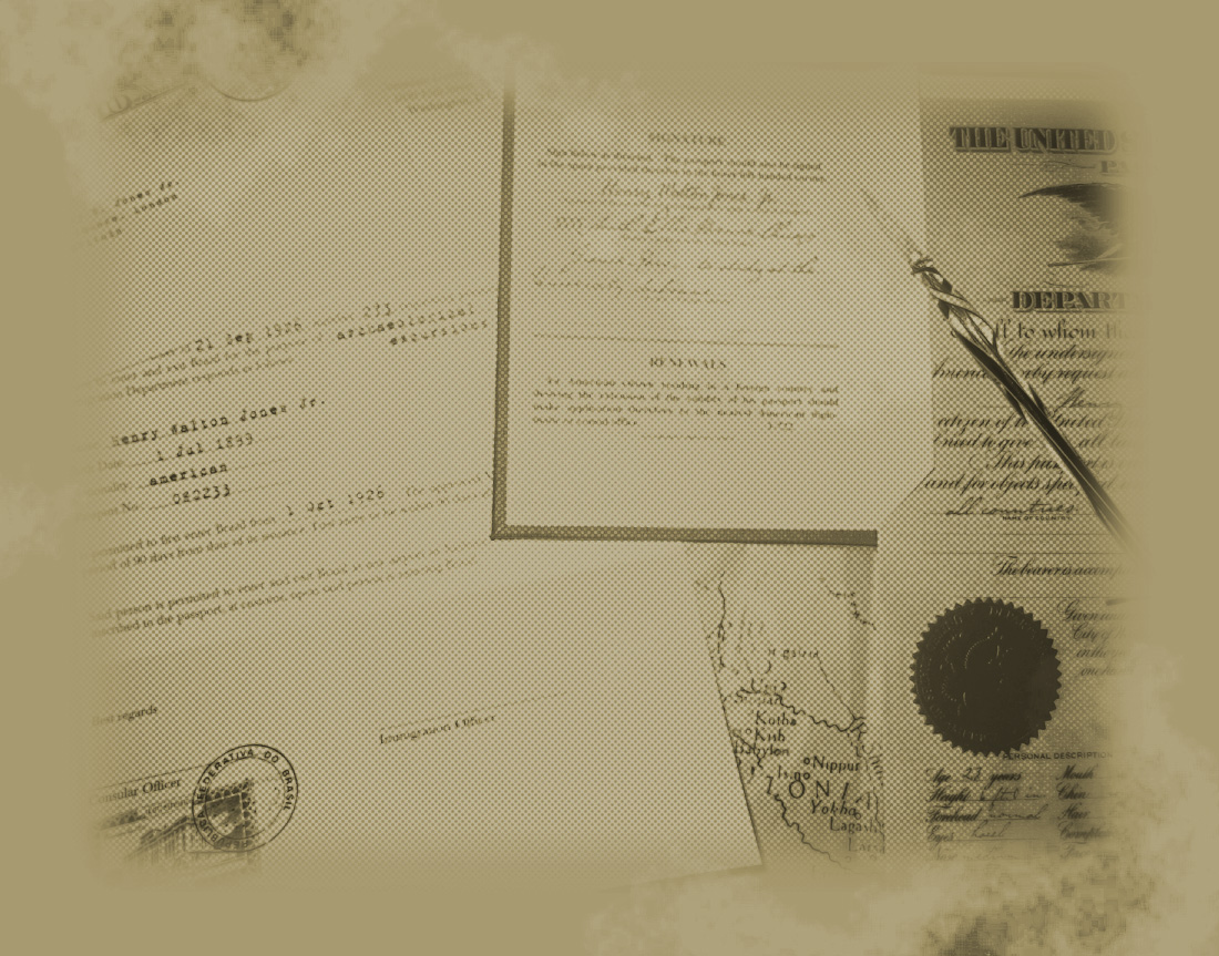 Als Vorlage hat ein originaler U.S. Reisepass von 1920 gedient, sodaß wir sehr genaue Vorstellungen von der Größe, Farbe und Art des Papieres gewinnen konnten. Anders als in den bekannteren U.S. Reisepässen befindet sich hier ein beidseitig bedruckter Einleger in DIN-A3 Größe im Inneren des Reisepasses, der dann mehrfach gefaltet wird, bis er die Reisepassgröße hat. Wenn man den Reisepass also aufklappt, hat man hinterher 2 Blätter, in DIN-A4 Größe. Die Vorderseite seht ihr oben mit dem ersten Layout. Auch die Details der Seiten kann man sehr gut erkennen.