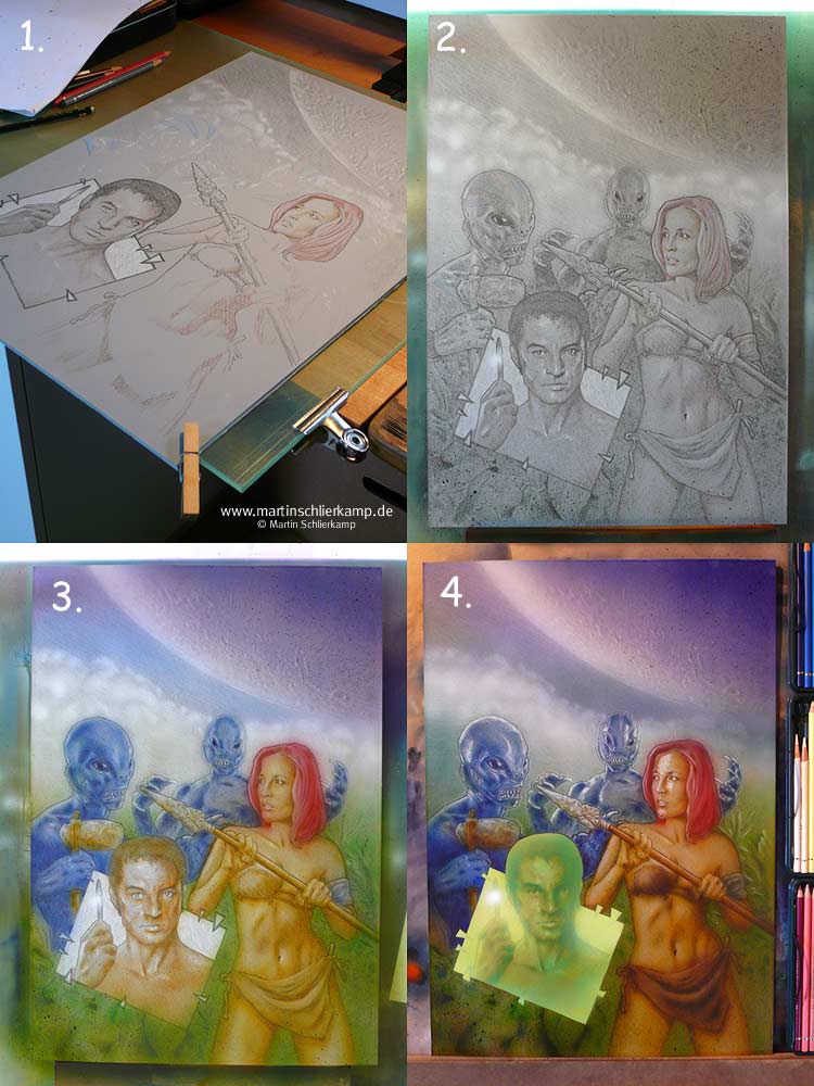 Martin, du weißt, ich liebe deine Arbeiten und mit wurde ja schon die Ehre zuteil, das Grundcompositing des Bildes zu sehen. Aber ich habe trotzdem einen kleinen Hauch der Kritik, die dir jetzt, nach Fertigstellung der Bleistiftzeichnung, eigentlich auch nix mehr bringt: Ich finde die weißen Outlines um die Figuren etwas zu schmal. Ich kann hier am besten in Photoshop-Begriffen reden, und wenn man die Outlines als "Schein nach außen"-Ebeneneffekt sieht, hätte ich einen deutlich höheren "Radius" gewählt (bzw. zusätzlich zum "Kontur"-Effekt noch einen halbtransparenten "Schein nach außen" hinzugefügt). Ich glaube, das würde die einzelnen Elemente noch ein bisschen mehr miteinander verschmelzen. Die Bleistiftzeichnung selbst ist aber natürlich über jeden Zweifel erhaben, da bis du inzwischen verdammt gut drin geworden