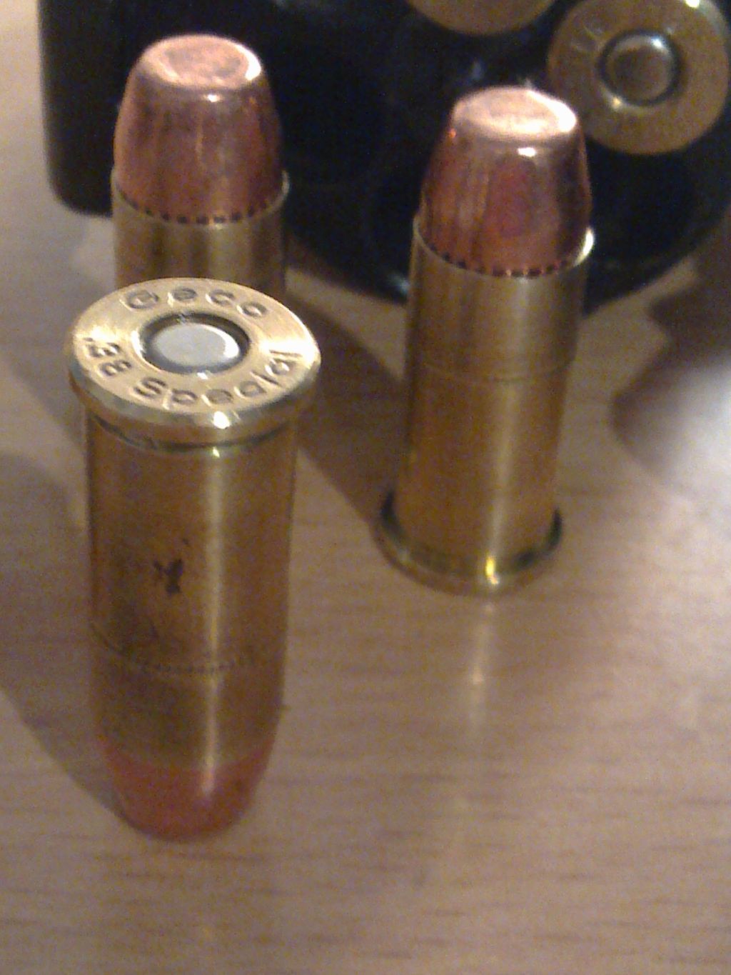 Hi melde mich hier mal kurz zu wort, mit ein paar Infos zu den Patronen. Es handelt sich um (aufs originalmaß der .38er webley) gekürzte 38special Hülsen, auf chemischem Wege deaktivierte Zündhütchen und einem 38er vollmantelgeschoss.