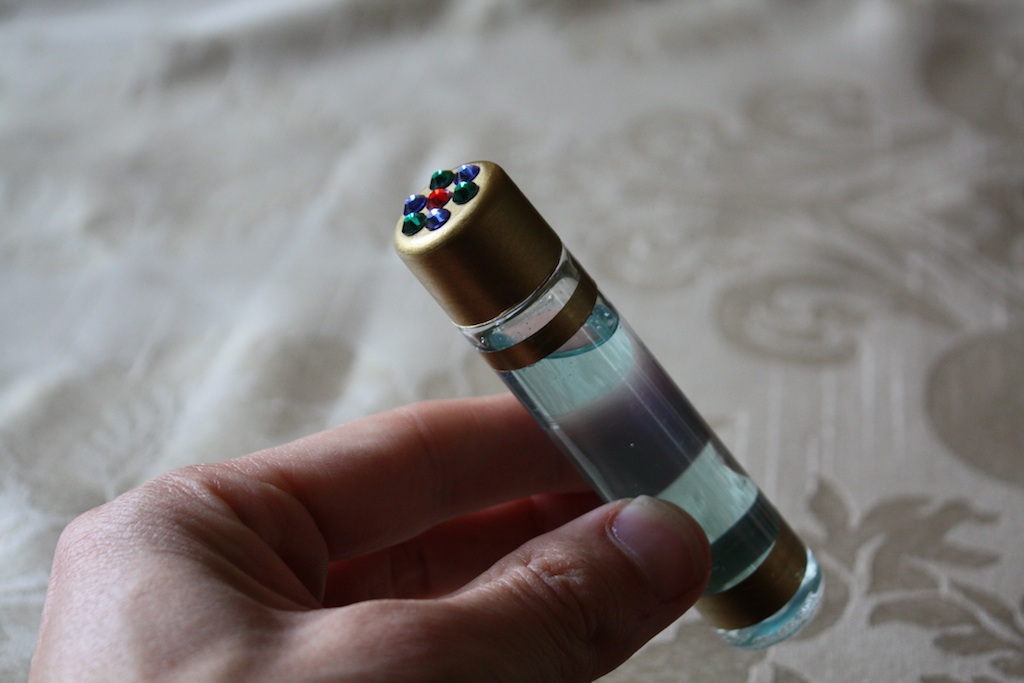 Eine kleines Duschgel aus einem Hotel erinnerte mich sehr stark an ein bekanntes Prop. Ich machte den Aufkleber mit der Beschriftung ab, lackierte die entsprechenden Stellen mit Goldfarbe und beklebte den Deckel mit farbigen Strasssteinchen. Fertig ist das Gegengift - gegen Körpergerüche