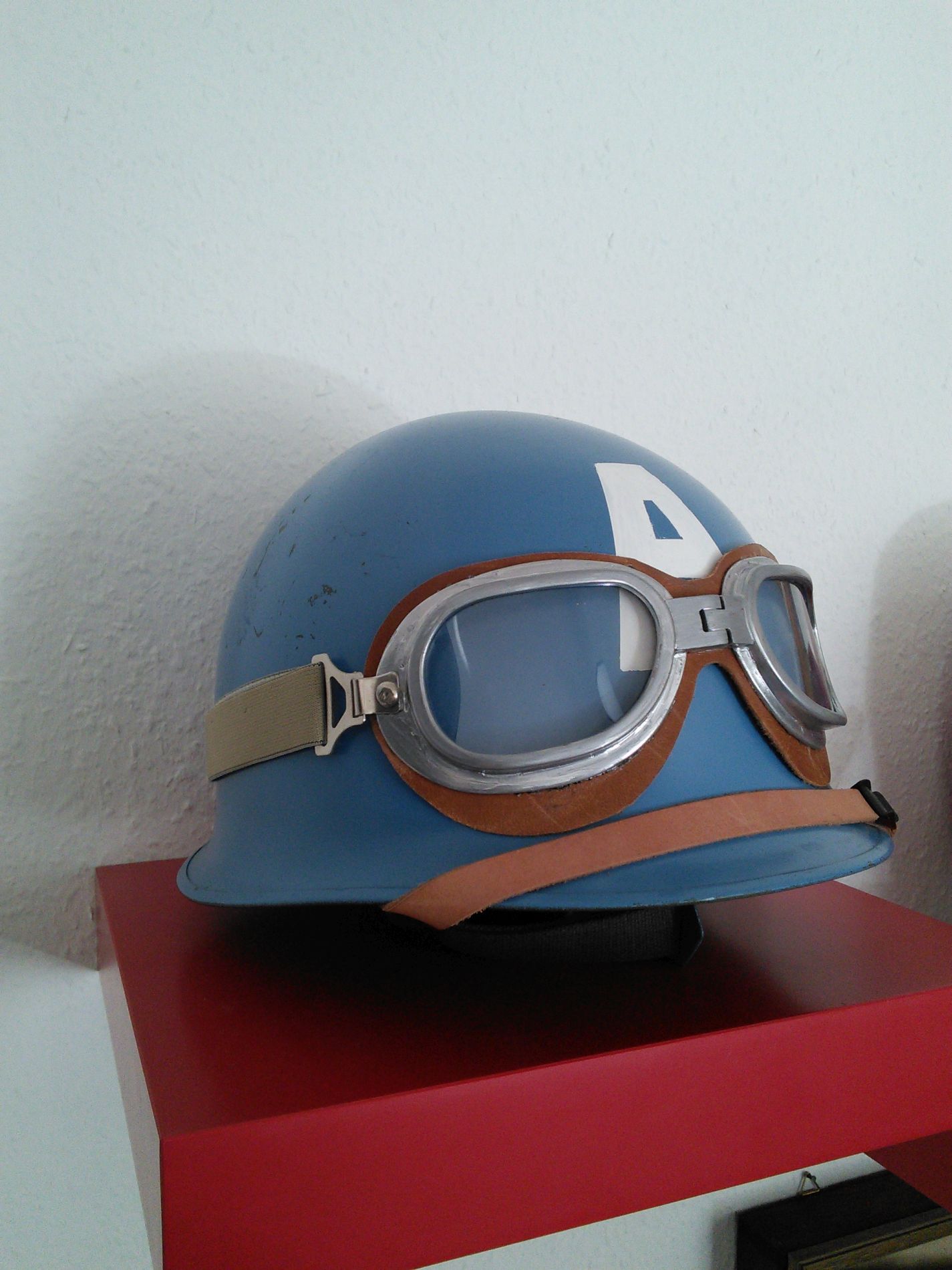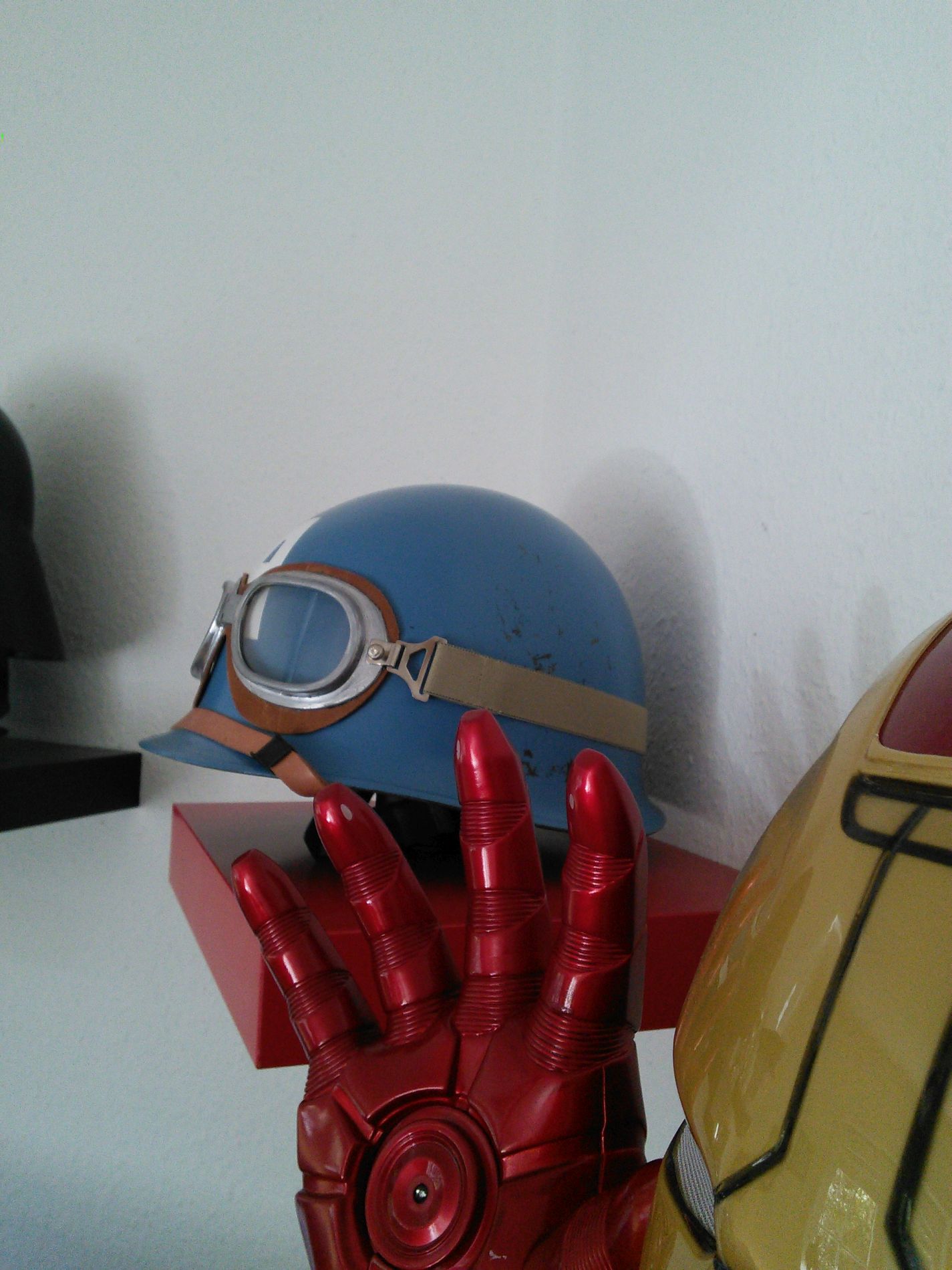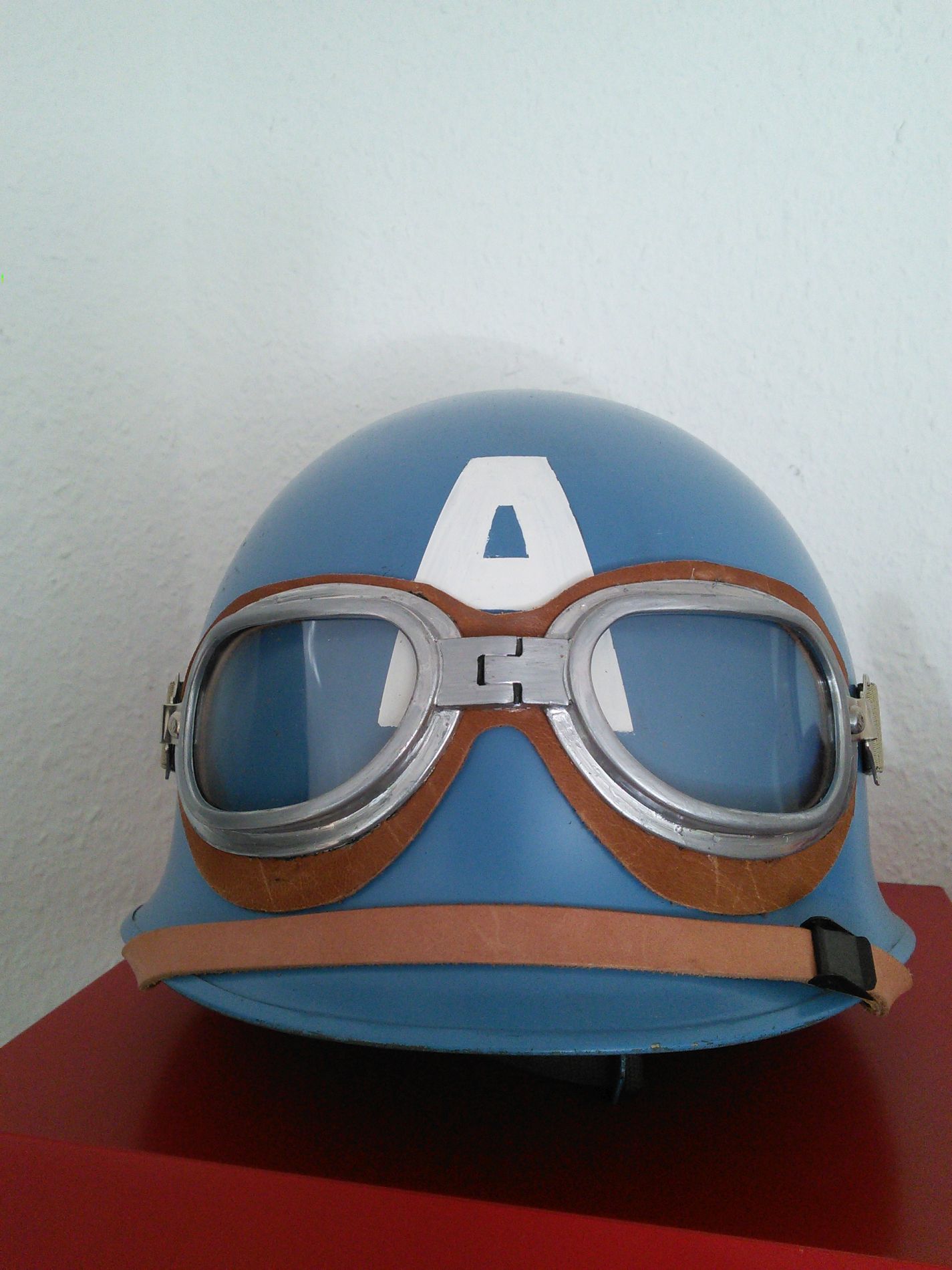 der captain america helm hat eigentlich die wenigste arbeit gekostet, hauptaugenmerk liegt eher auf der brille, habe dafür ein billigprodukt (2,80euro, incl. versand) aus hong kong umgebaut und für 1,50 euro hosenträger als riemen benutzt.