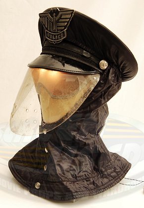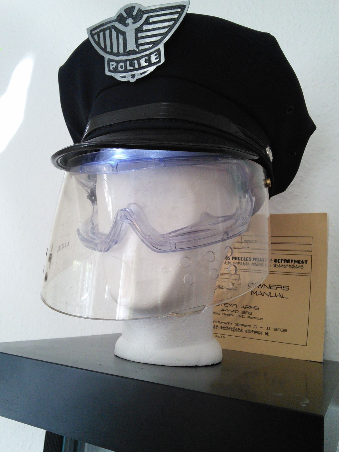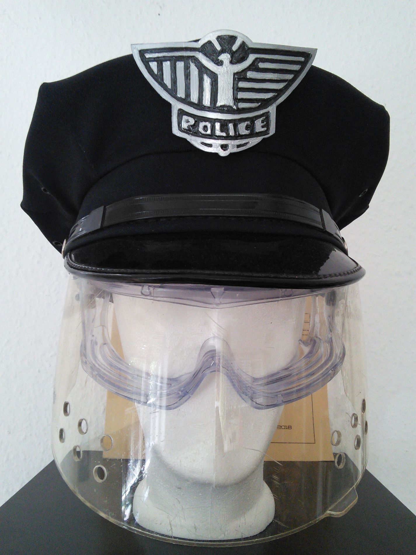 für die blade runner police cap fand ich auf dem flomarkt eine alte originale polizeimütze aus den staaten für 5euro. der policebadge habe ich aus einem stück plastik herausgedremmelt. das visier stammt von einem alten motorradhelm. löcher und seriennummer wurden von mir hinzugefügt. wie im film befinden sich unter dem schirm 2 kleine leuchten.