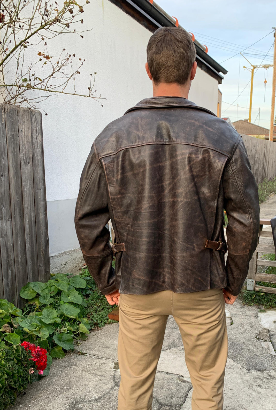 Aus meiner Sicht farblich recht nahe an "Tempel des Todes" oder "Jäger des verlorenen Schatzes". Nach Auskunft des Verkäufers tendiert die Jacke mit der Zeit auch eher dazu heller zu werden, je nach Pflege und Abnutzung.