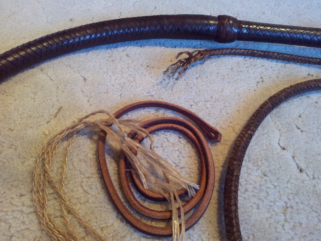 Zur Peitsche: Das sieht echt übel aus. Die Verbindung zwischen Fall (dem einzelnen Lederband) und Peitschenkörper scheint komplett gerissen zu sein. Selber reparieren wird kompliziert, aber vielleicht hat Dusty ja noch einen Tipp. Wenn du sie einschicken musst wird das aber sicher länger dauern als eine Woche. Darf man fragen wie das passiert ist?