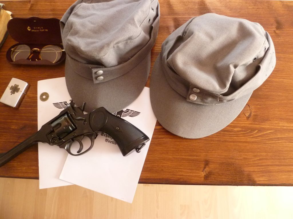 Die Brille und das Fernglas stammen beides aus Ebay. Hab ich zu je 20¤ erworben. Ich hätte gerne ne bessere Geschichte für euch parat wie "Von meinem Opa ect." - dem it aber nunmal nicht so. In die Brille hab ich mir Gläser in meiner Sehstärke machen lassen damit ich auf diversen Events diese auch mal tragen kann. Kontaktlinsen vertrage ich nicht besonders. Das Fernglas it ein Feldstecher aus dem 1. weltkrieg. So wurde es zumindest angegeben. Das soll zum Elsa Schneider Dessert Outfit für meine Freundin. Die Feldmützen sind zweimal da weil mir vorher eine falsche Größe geschickt wurde, mir daraufhin das Angebot unterbreitet wurde, man schicke mir die richtige und die andere darf ich ebenfalls behalten. Also hab (leider) keine zwei Elsa's ^^