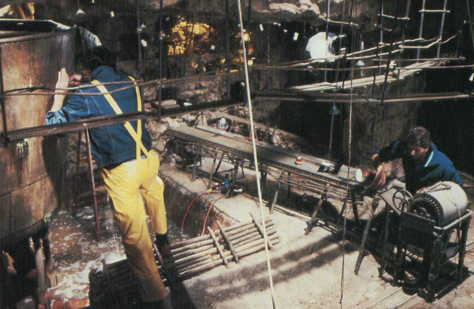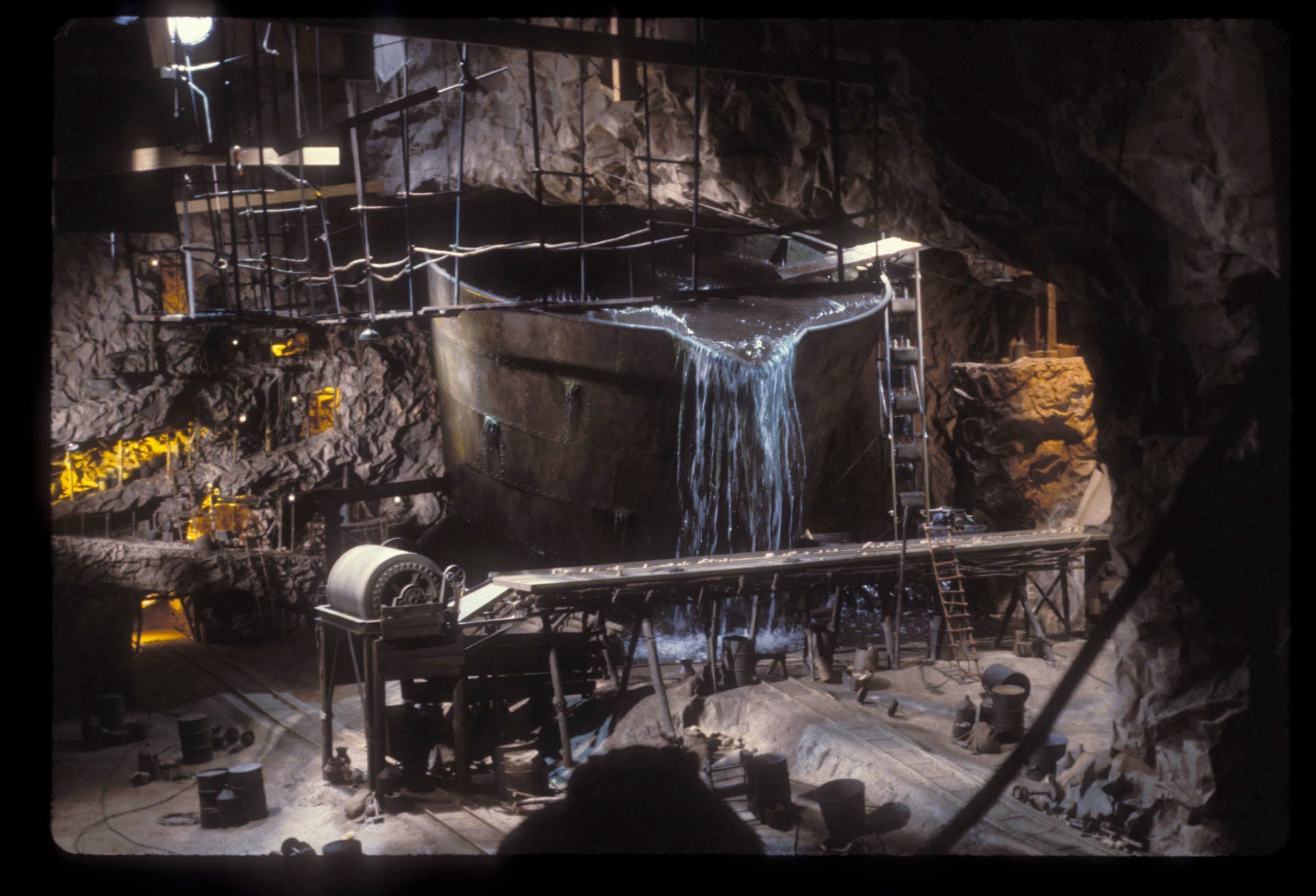 Nachträgliche Anmerkung des Autors:komplett neuer Text, da ich mittlerweile habe das Gefühl habe, dass dieser Bühne doch nicht für die Szene, wo das Wasser durch den Tunnel geschossen kam gebaut wurde, sondern vielleicht eher für die Szene, wo der große Tank umkippt. Ok, danke für den Erklärungsansatz. Und ja, so sah es im Film aus. Aber ich kann mir nicht vorstellen, dass das real so ähnlich passiert ist. Mit Sicherheit wird da niemand irgendwelche Balken (auch nicht per Fernbedienung) weggehauen haben. Ich sehe auch keine beweglichen Stützbaken auf den Grafiken, nur sowas wie "Balsa Pieces". Ich vermute eher einen Kipp-Mechanismus, ausgelöst durch eine Art Pneumatik, eventuell unterstützt durch riesige Schaniere oder Ähnlichem.. Wie voll war dabei wohl der sichtbare Tank? Ich sehe dort keinen zweiten Boden oder ähnliches. Und randvoll müssten das ja Tausende von Tonnen gewesen sein. Meine Vermutung: der große Tank war komplett leer. Dann ist der Tank also (für mich wahrscheinlich) stattdessen nach Auslösung des Kippens ins volle Becken gefallen. Oder habe ich das grundsätzlich falsch im Kopf?