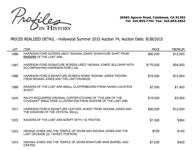 Der Vollständigkeit halber, hier noch die Indiana Jones bezogenen Sachen aus der letzten Profiles In History Auktion