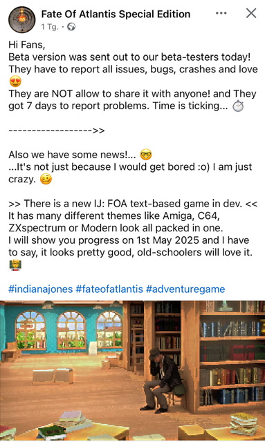 Hi Fans! We have started a new twitter for Indiana Jones and the Fate of Atlantis Special Edition. This page will have all development images since the first version of the Fate of Atlantis Special Edition in WME till recent build, lots of famous quotes from the game, Easter eggs, flashback memories with original creators, updates about new development, Indiana Jones information in general, Atlantis and Nazis in the film, also If we have a questions or requests about how you can help us. You are more than welcome to join!
