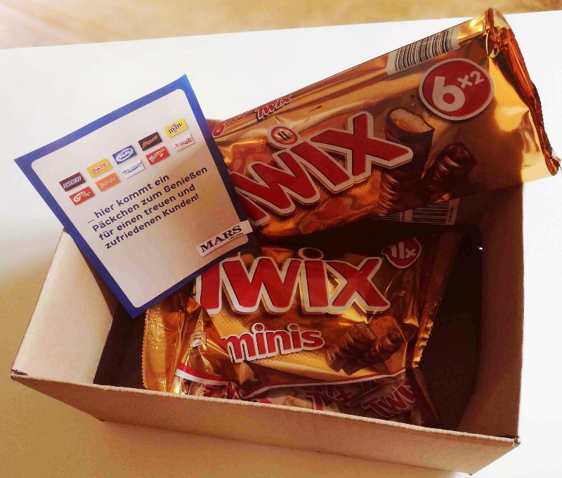 Was ich geschrieben habe ist mir so hochgekommen, Pascal. Für meinen Geschmack ist so ein Paket eine zu offensichtliche, buchstäblich caramelklebrige Kundenbindungsmaßnahme, die psychologisch dazu bringt, etwas zurückgeben zu wollen, in dem Fall weiterhin Twix zu kaufen und bei Freunden positiv über Twix/MARS zu berichten. Wenn's öffentlich in einem Forum passiert, für nur ca. 4 ¤ (oder wieviel kosten die beiden Packungen zusammen?), umso besser.