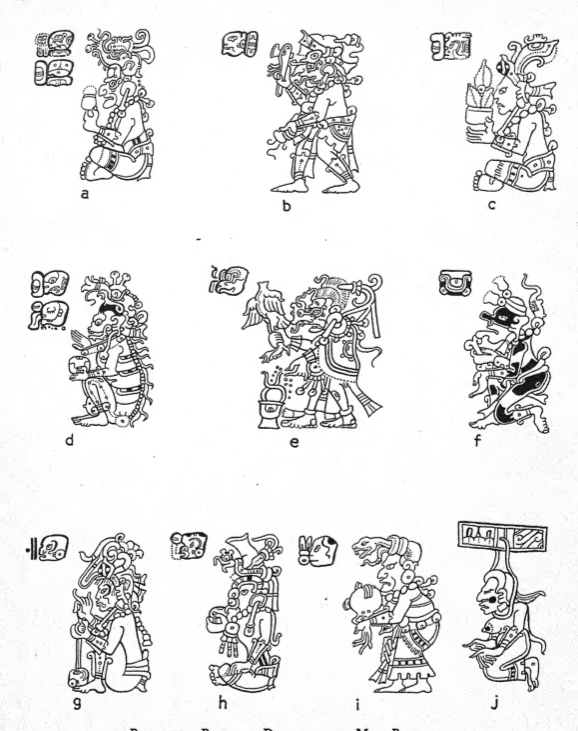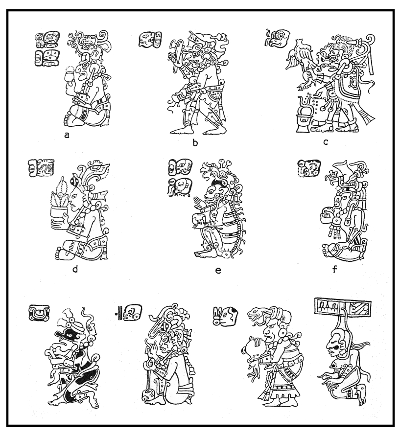 Der Schlangenmann ist eine "Frau", nämlich "Ix Chel" Der andere ist "Kawiil", aber die Darstellung mit dem Vogel und dem Pott finde ich nicht, wahrscheinlich dazugedichtet.