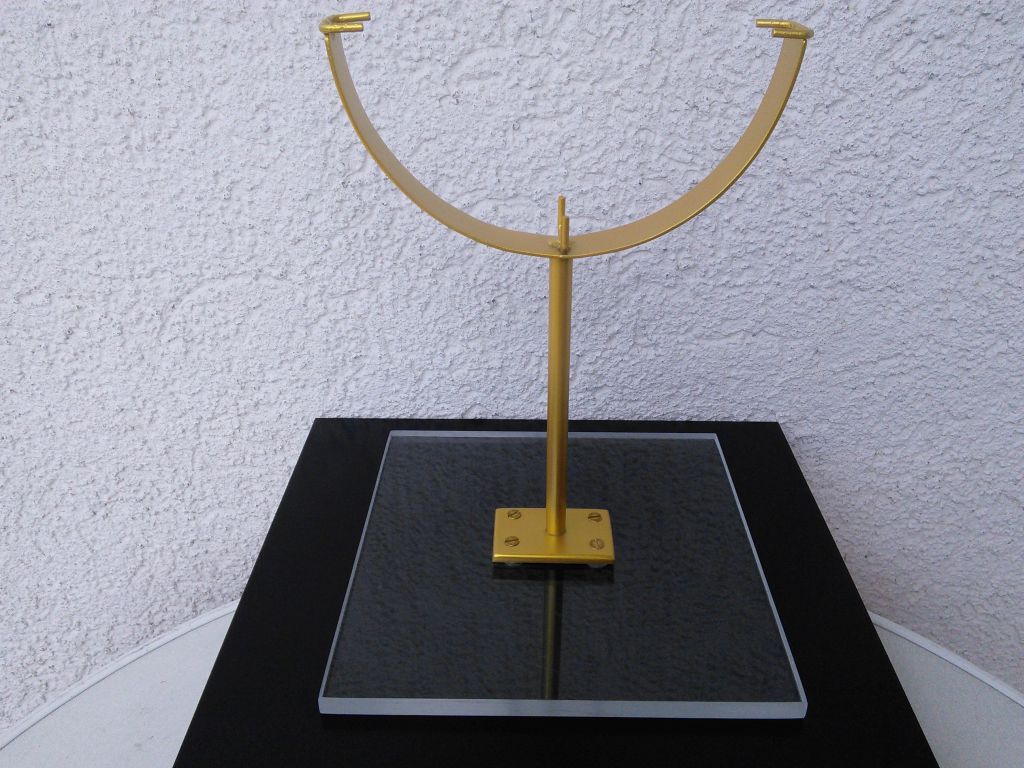 Ich habe auch ein hochauflösendes Komplettphoto, suche ich heute abend raus. Die kleine metallene Basis ist auf eine Plexiglasplatte mit abgeschrägten Kanten gesetzt, die wohl leicht zu besorgen ist.