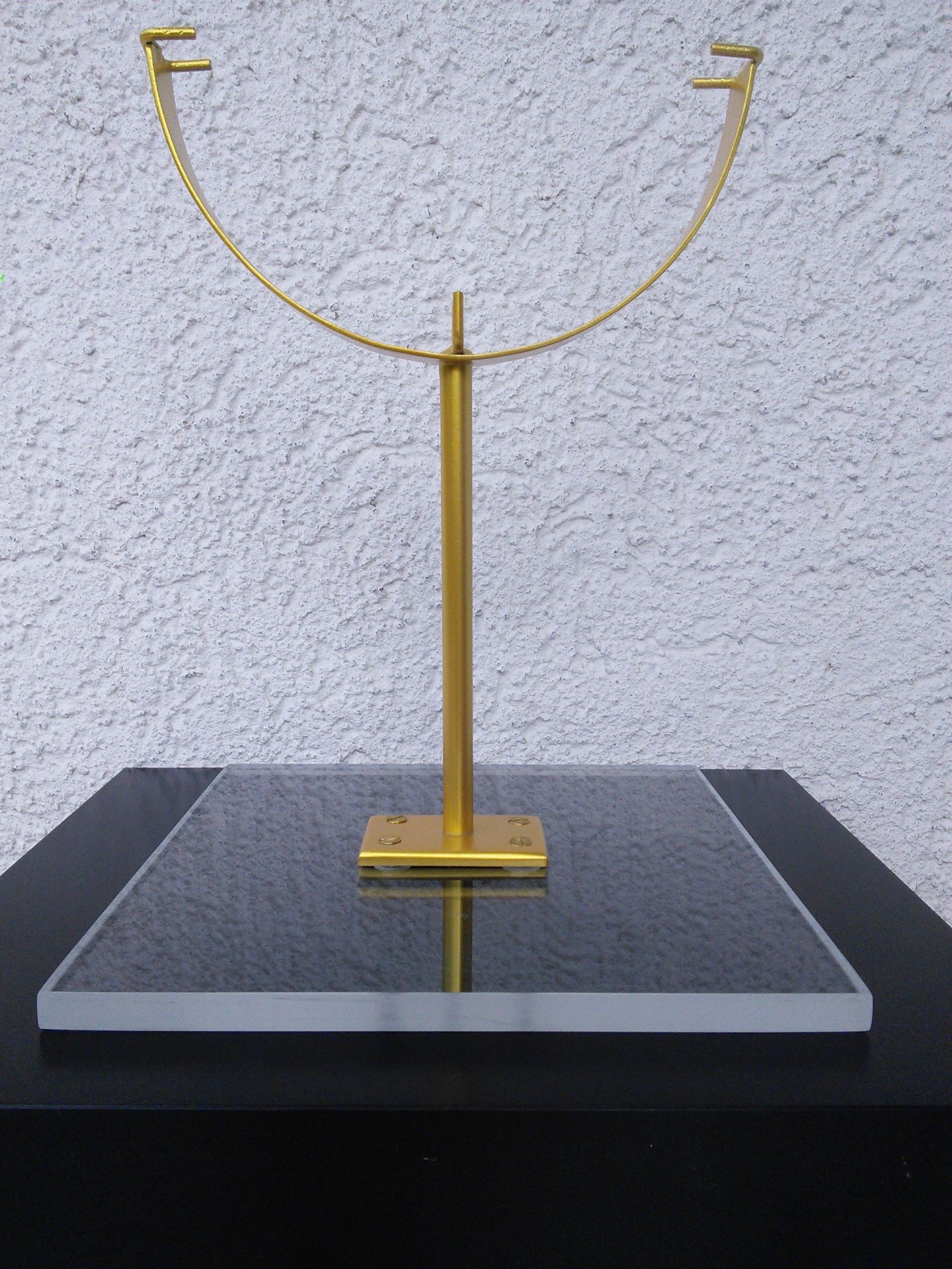 Schönes Teil, ist auch kein Problem so ein stand anzufertigen! Acrylglasplatte in geeigneter Größe ist vorhanden. Was nicht schlecht wäre, wenn du auf ein stück karton die genauen Umrisse aufzeichnest,( wegen der Unregelmäßigkeit) mir deine gewünschte (oben/unten) Position markierst und mir einfach zu schickst. Dann brauche ich noch die Dicke, da dieser halbkreis aus einem Flachstahl besteht den ich dementsprechend dimensionieren muss.