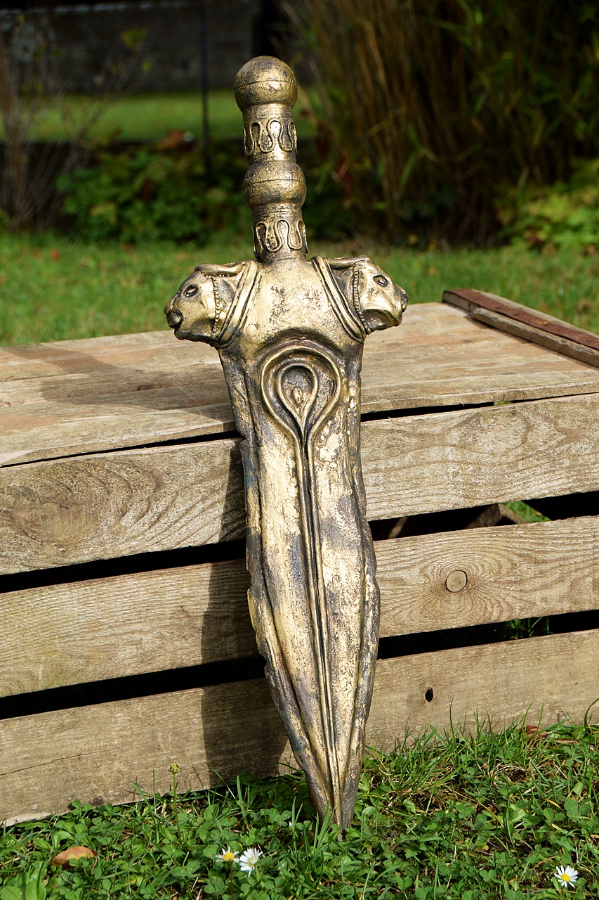 Und zu guter Letzt ein wahrliches Riesen-Teil; der Dolch des Mithras, wie er am Ende des Abenteuers zu sehen ist. Er misst riesenhafte gute 50cm in der Länge, bei einem Kampfgewicht von über 800 Gramm. Er setzt sich aus Resin und etwas Buchenholz zusammen.