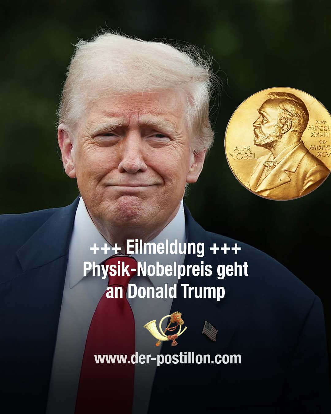 Stockholm, Washington (dpo) - Der Nobelpreis für Physik geht in diesem Jahr in die USA: Für den Nachweis, dass es keinen CO2-Fußabdruck gibt und die Klimakrise eine riesige Abzocke ist, wird US-Präsident Donald Trump mit der renommierten Auszeichnung geehrt. "Donald Trump hat die Forschung auf dem Gebiet der Physik seit Jahren geprägt", heißt es in der Begründung des Nobelpreiskomitees. "Sein neuester Geniestreich ist der bahnbrechende Nachweis, dass sich über 99 Prozent aller Klimaforscher geirrt haben und der Klimawandel der größte Betrug aller Zeiten ist. Umso beeindruckender ist diese Leistung, wenn man bedenkt, dass es dafür keinerlei physikalisch belegbare Nachweise gibt. Er hat das praktisch aus dem Nichts einfach festgestellt." ...