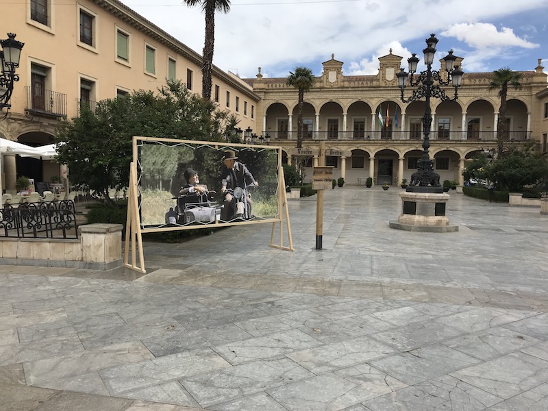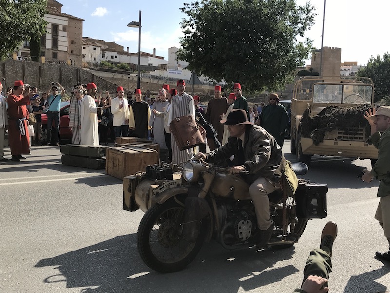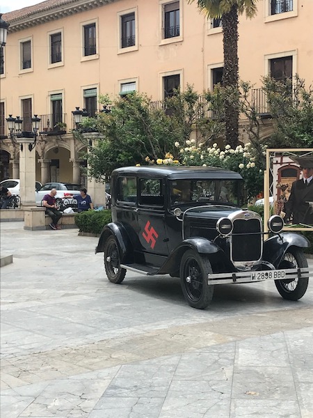 Wir haben dann noch ein kleines Shooting mit der Bahn gemacht, bevor wir wieder zurück ins Zentrum gefahren sind, wo vor der Kathedrale schon ein Basislager der Wehrmacht aufgebaut worden war. Aber vorher stand auch noch "Whip-Cracking" auf dem Plaza de las Palomas an. Da durfte jeder mal die Peitsche schwingen, nach Lust und Laune. Die Spanier sind da deutlich entspannter gewesen, aber entgegen meiner Befürchtungen gab es keine Verletzten. Der Oberpeitschenschwinger kam stilecht in einem alten Ford angefahren. Nur das Hakenkreuz hätte ich nicht auf den Wagen geklebt. Naja. (Siehe Foto)